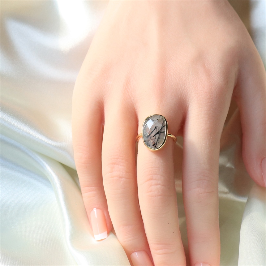 ブラックルチルクオーツ ラフカット シルバーリング 18KGF 天然石 トルコジュエリー カラーストーン