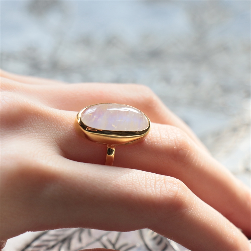 幻想的で奥行のある輝きが魅力のレインボームーンストーンのリングです。角度を変えるたび、乳白色の石の中に鮮やかなブルーのシラーが浮かび上がります。ぷるんとした縦長のオーバルフォルムは、指をほっそりと長く見せてくれる嬉しい視覚効果があります。