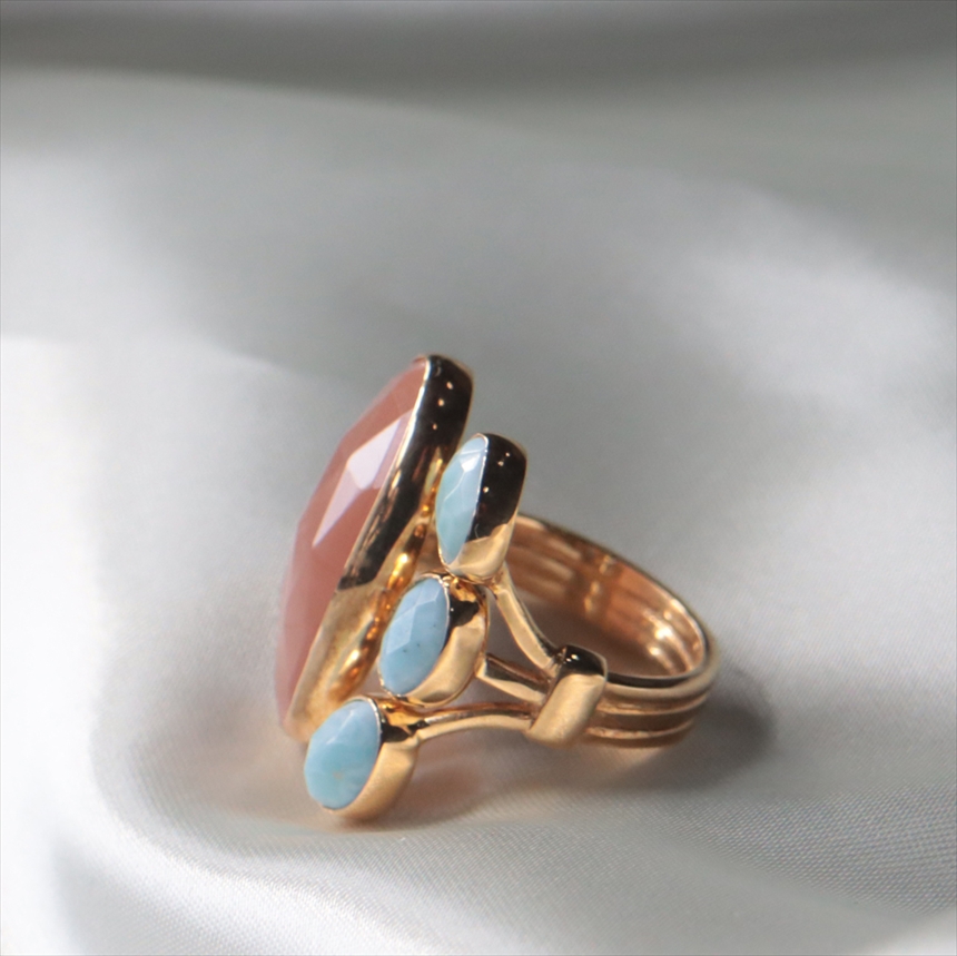 「太陽の石」サンストーンと、深い安らぎをもたらす「海の石」のラリマー。二つの石のコントラストが、身につける人の心を明るく穏やかに整えます。指のラインを美しく見せる縦長のシルエットの大きなサンストーンに対して、小ぶりなラリマーを3つ並べることで、重厚感と軽やかさが絶妙なバランスのデザインです。
