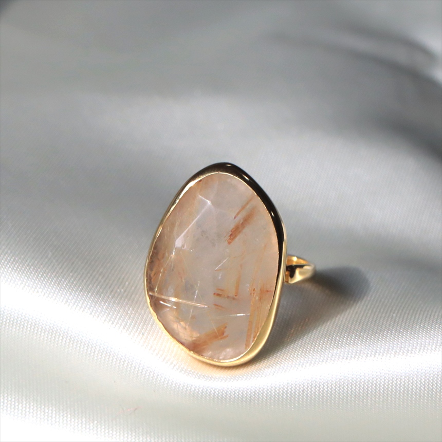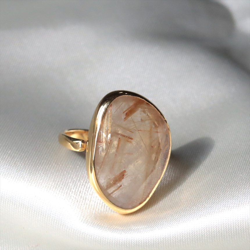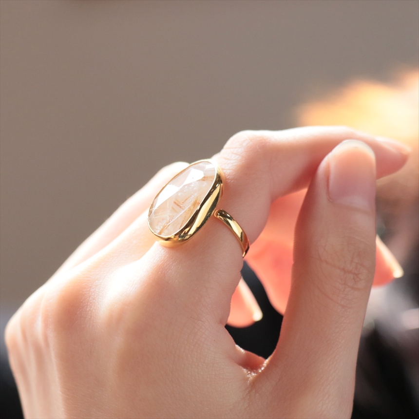 クリアなクォーツの中に繊細なゴールドの針(ルチル)が閉じ込められた、自然が生んだ神秘ともいえる、ルチルクォーツのリングです。肌に溶け込むヌーディーな色調にゴールドが煌めき、手元をより洗練された知的な印象にみせてくれます。