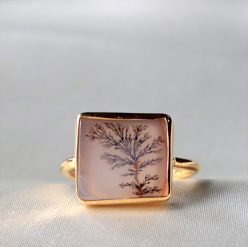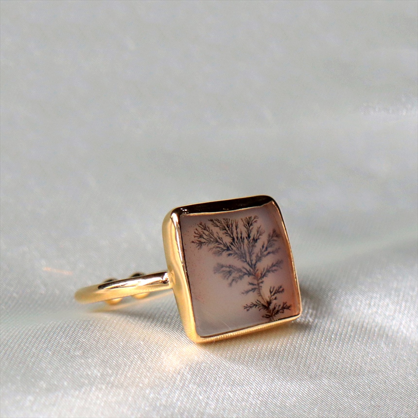 やわらかな乳白色の水晶の中にシダ植物のような模様(内包物)が広がるデンドライトのリングです。一粒ごとに異なる絵画のような天然石の表情が、手元を見るたびに深い癒やしを与えてくれます。