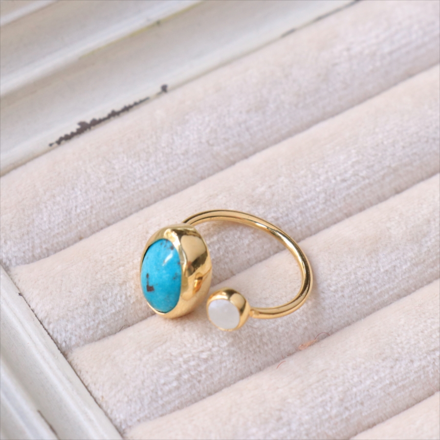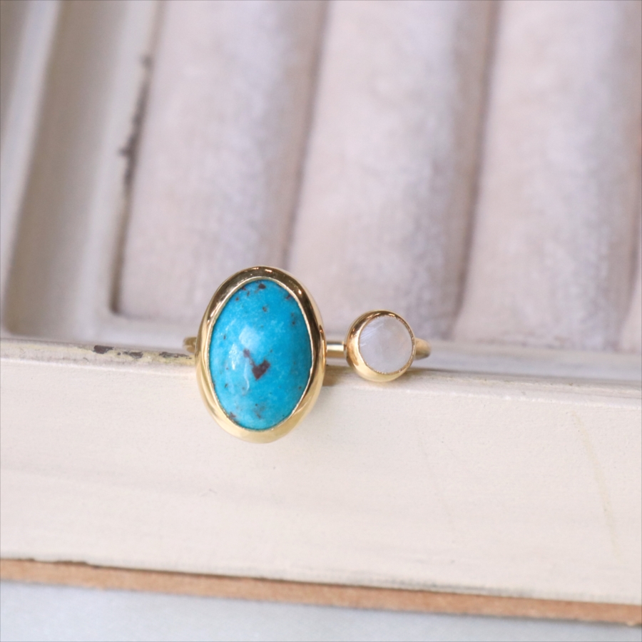 原石の雰囲気をそのままに大粒のマットなブルーカラーのターコイズに寄り添うコロンとしたムーンストーン。ゴールドカラーとの相性が良く上品な印象です。