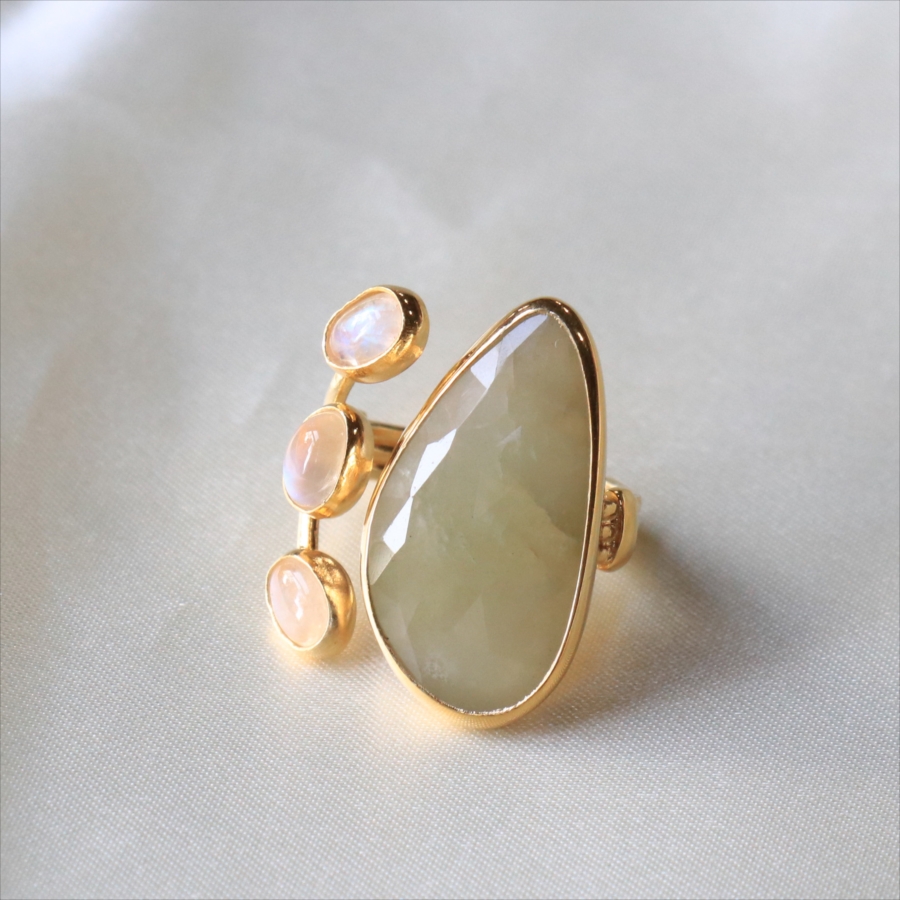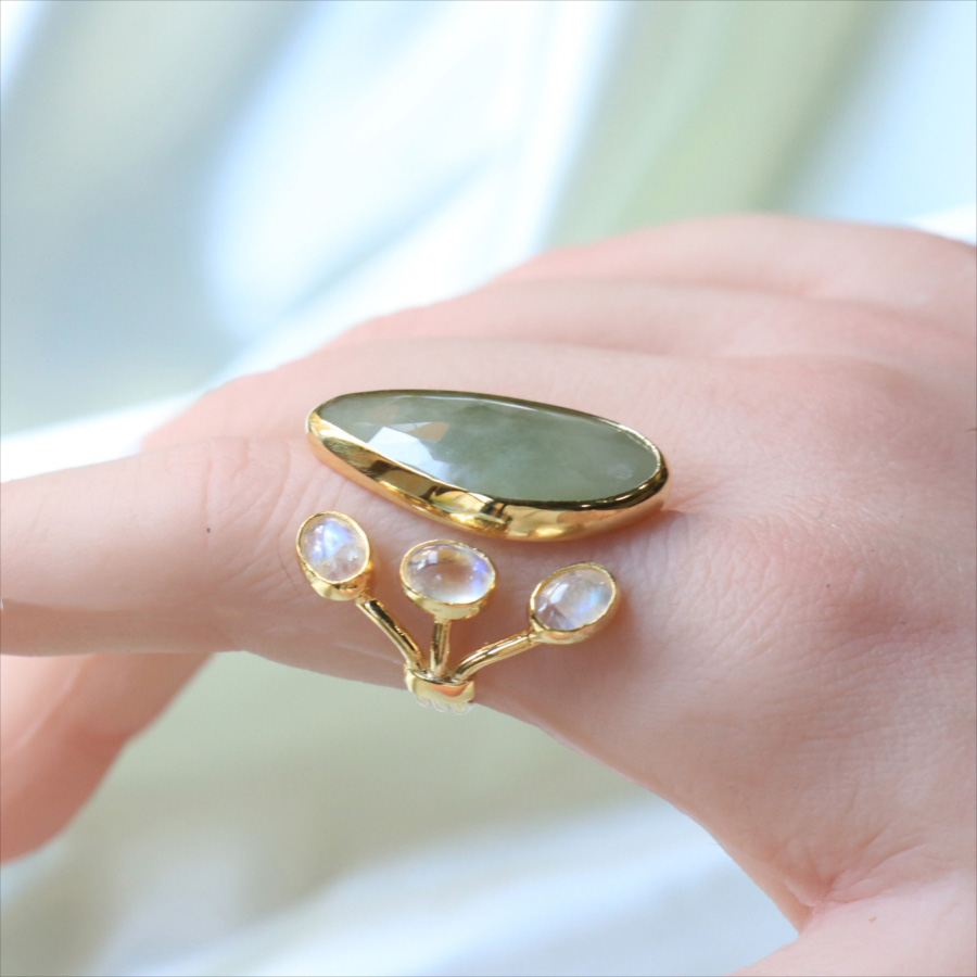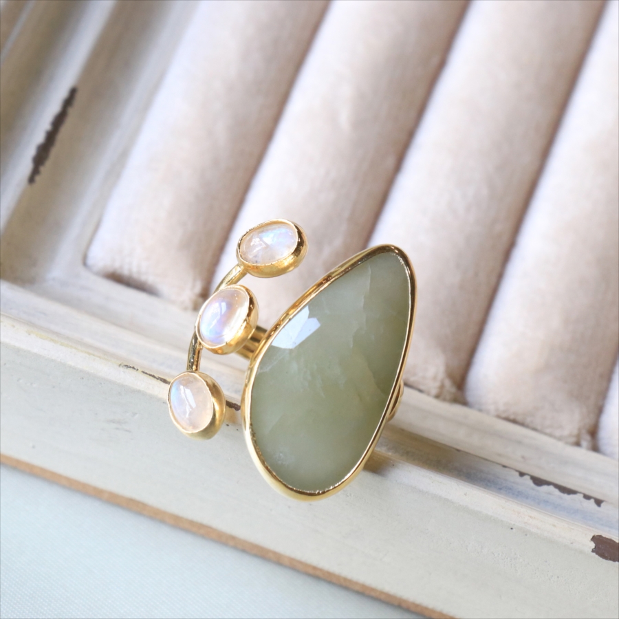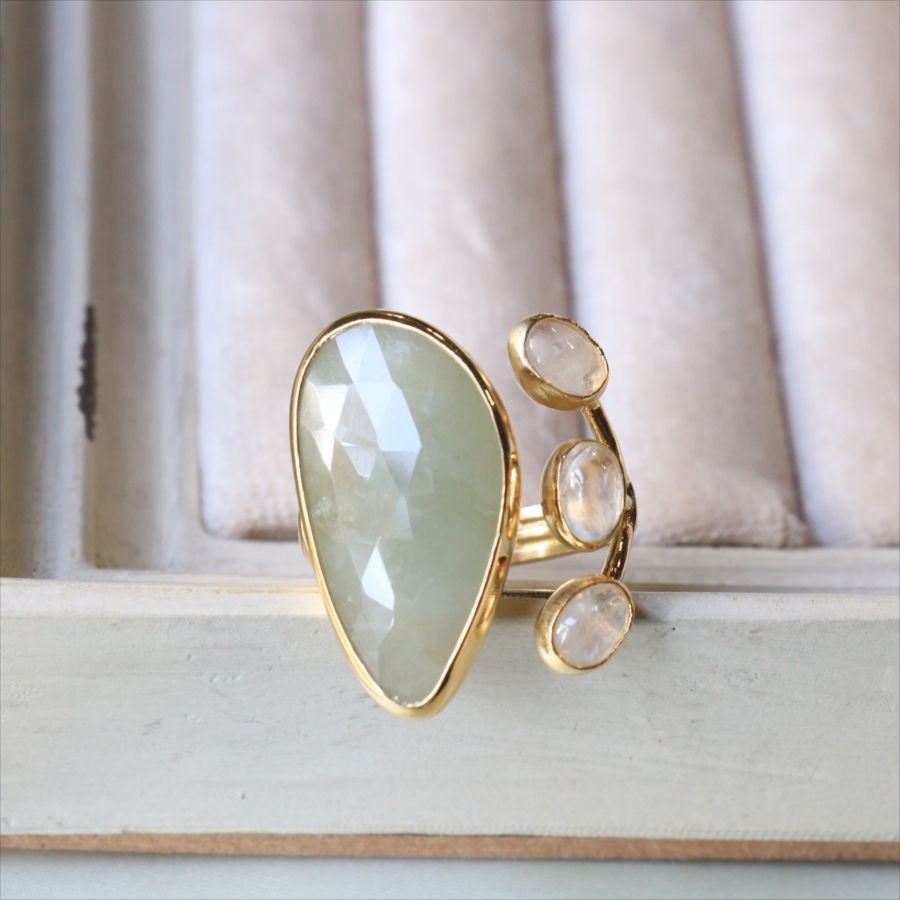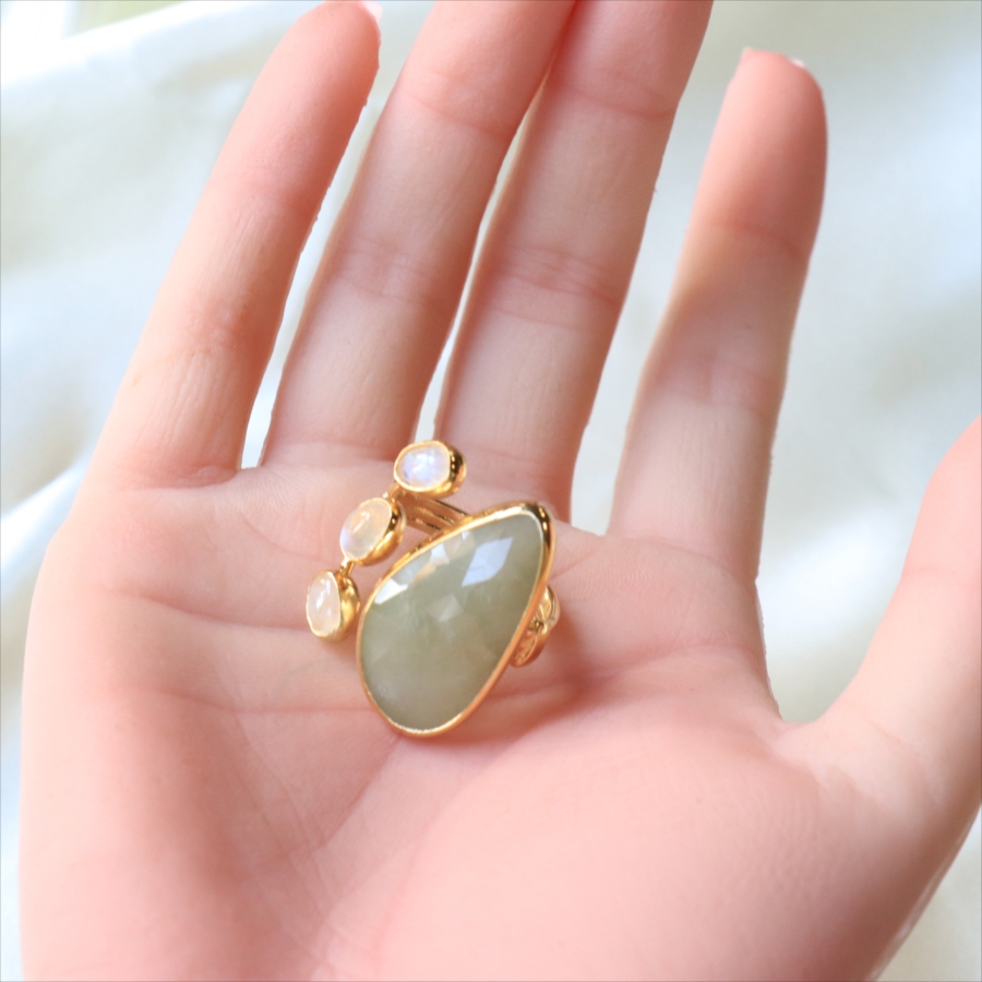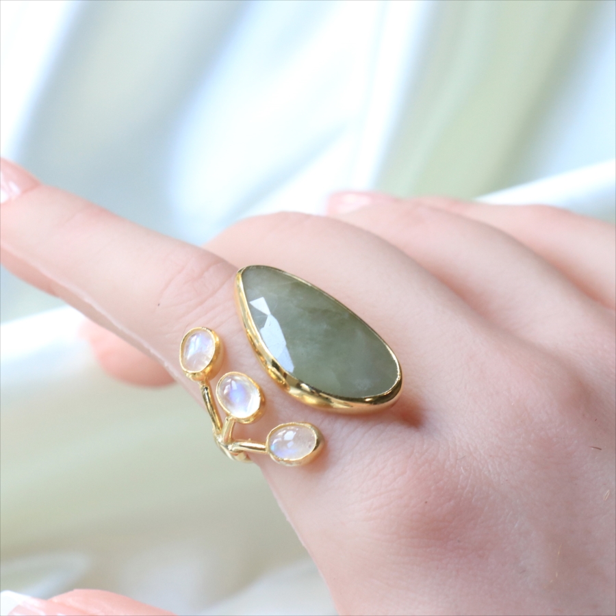 とろみのあるミルキーグリーン美しい大粒のサファイア。かわいらしいサイズのカボションカットのムーンストーンが三つ寄り添うようについたデザインのリングです。絶妙なニュアンスカラーが上品さを引き出します。それぞれの石は裏面が抜けているので、光を透す仕様になっています。※サファイア2.7×1.5cm
