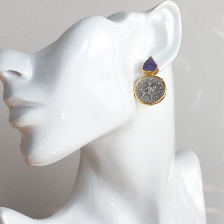 ドロップ形のラピスラズリと、とシルバーコインが並んだ立体感のあるスタッドピアスです。ハンドメイドらしい無骨なデザインが魅力。(コインは、アンティークコインのレプリカ ROMAN EMPIRE GERMANICUS 15BC)※コイン直径1.8cm