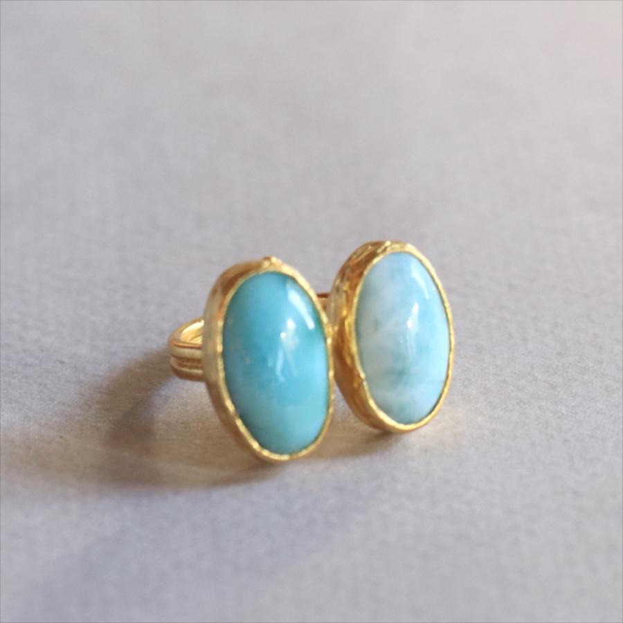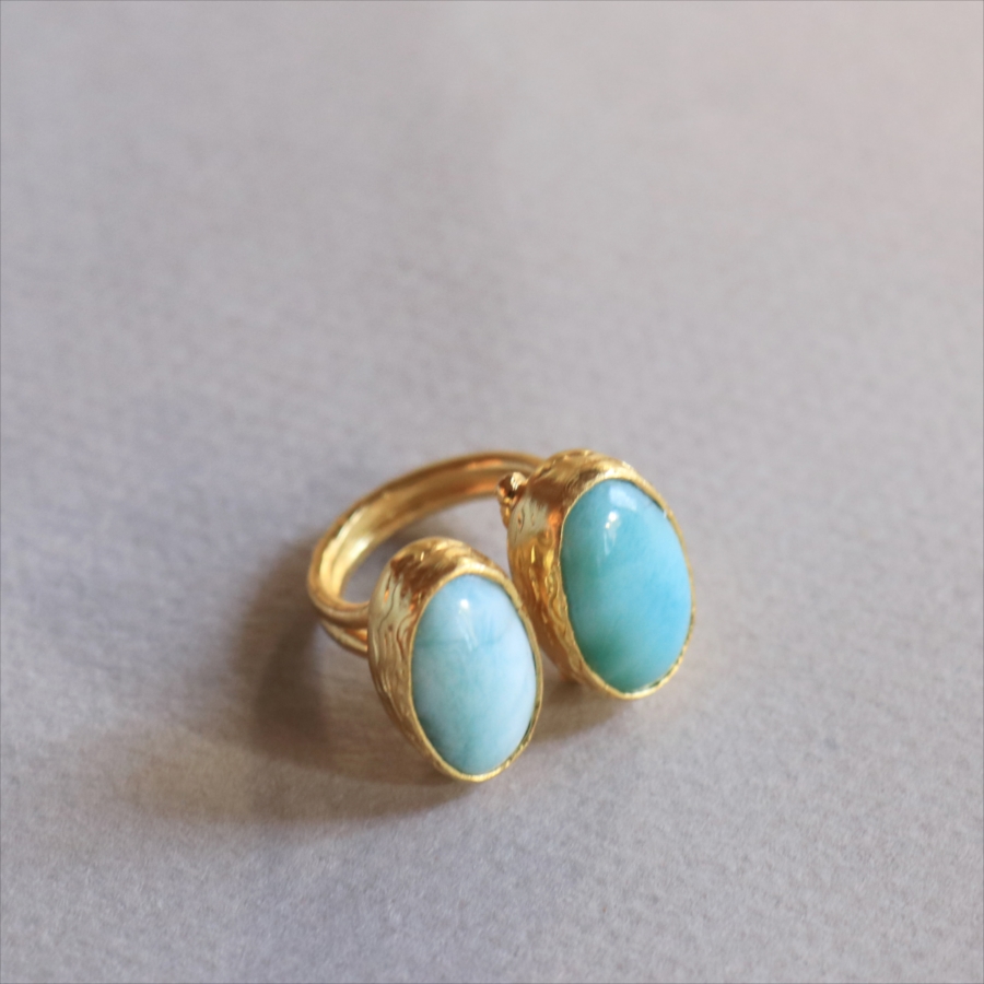 海に映る雲のような模様が広がる、優しいブルーが美しいラリマーダブルリングです。双子のように並ぶオーバルのラリマー。シンプルながらも個性的が光る一点ものジュエリーです。