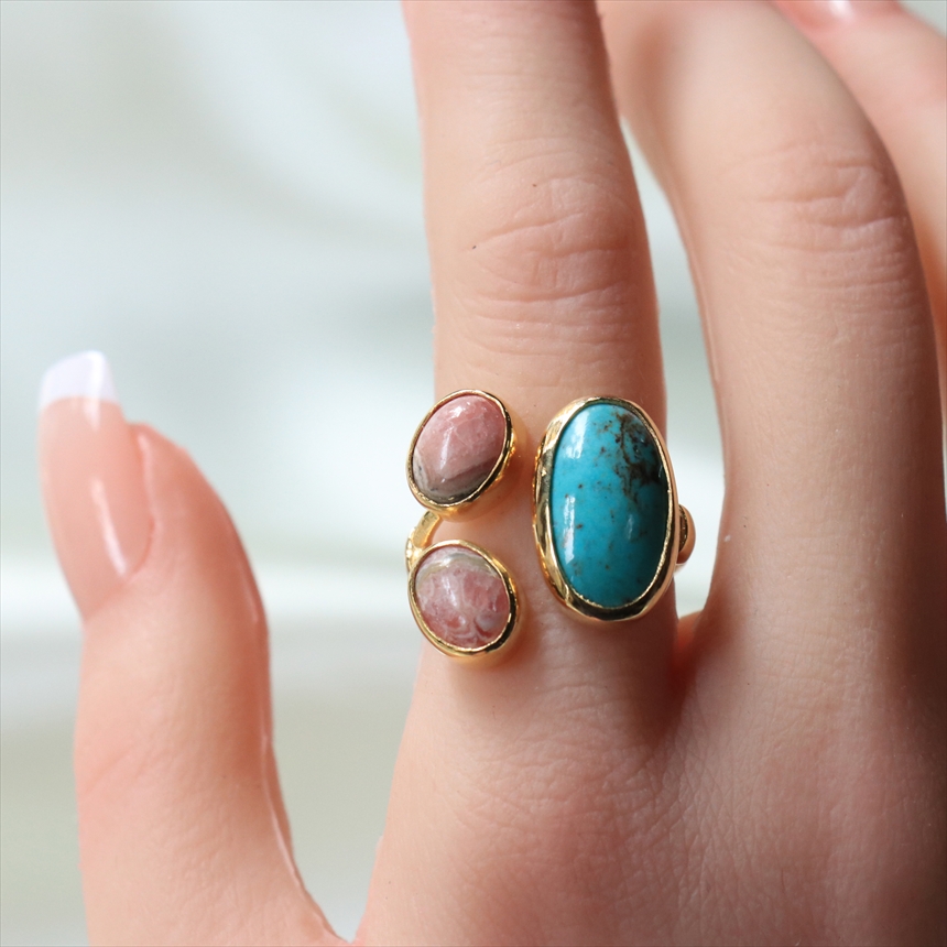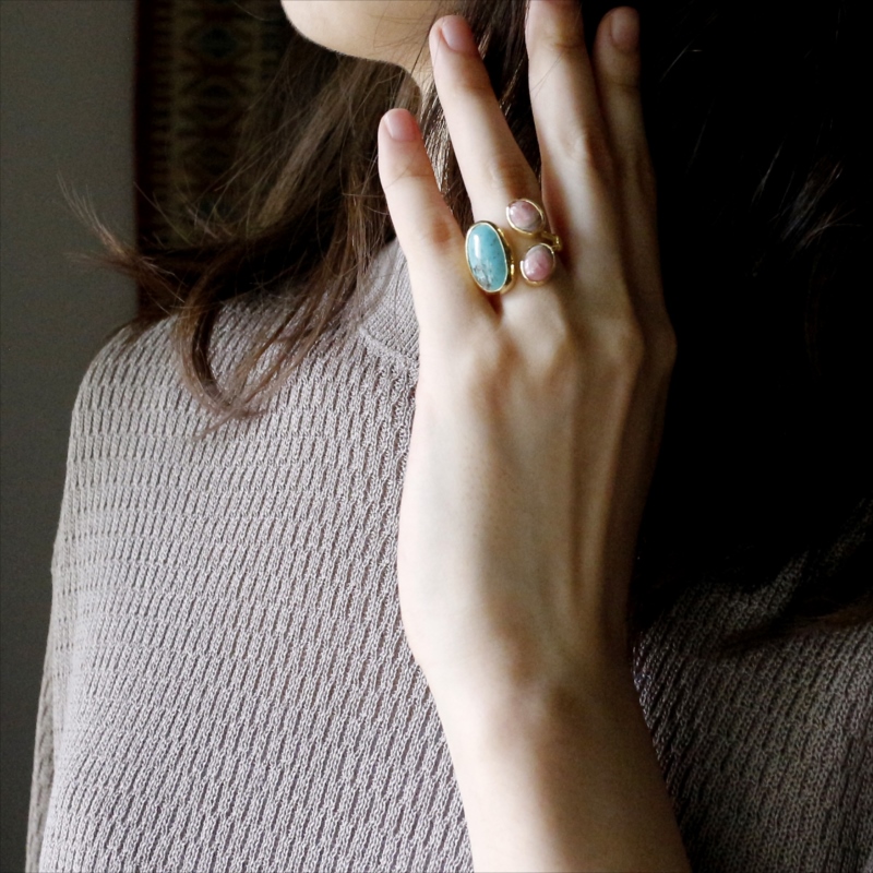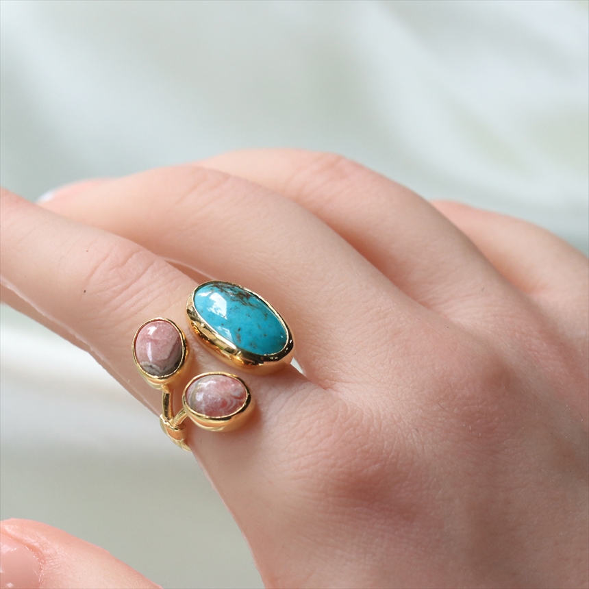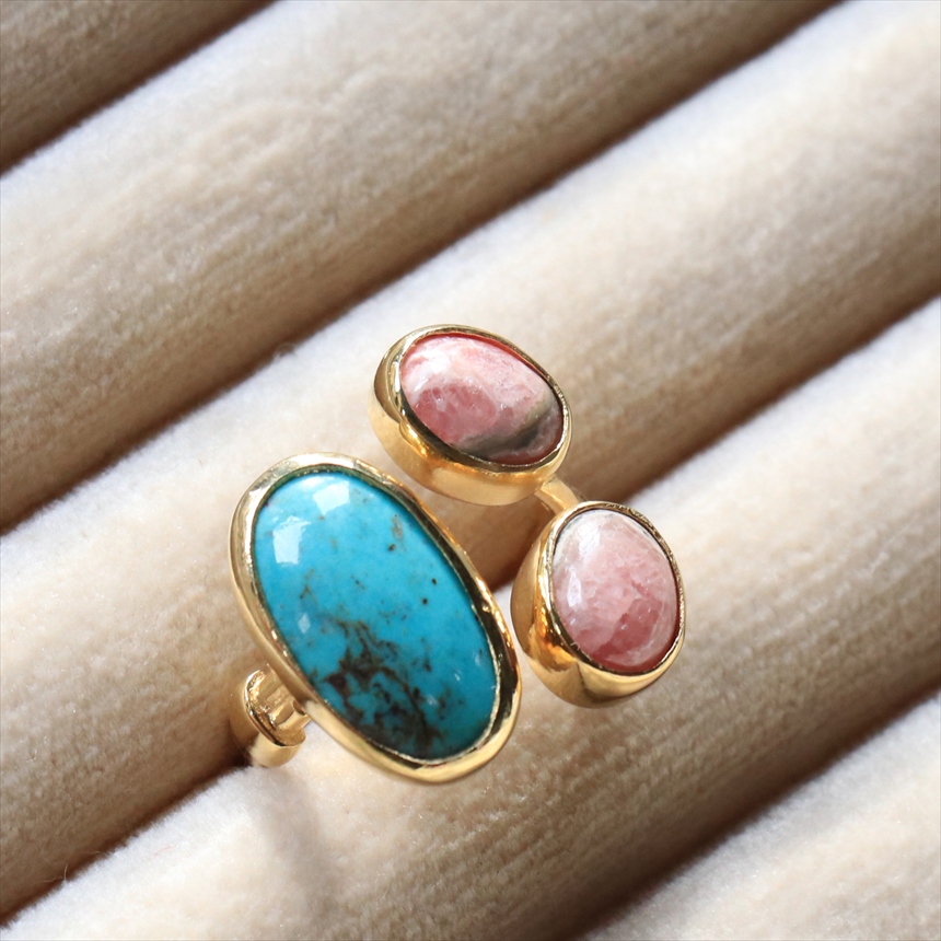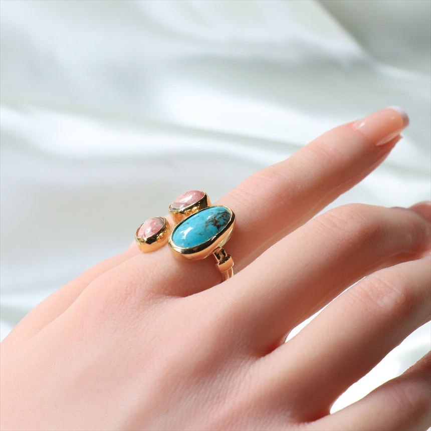 大きめのオーバルカットのターコイズと、カボションカットのコロンとしたロードクロサイトが寄り添うようについたデザインのリングです。赤みのあるピンクカラーのロードクロサイトが全体に温かみを与えてくれています。※大きいターコイズ1.7×1cm