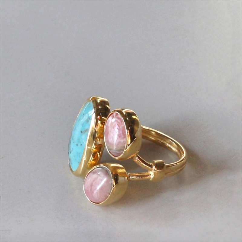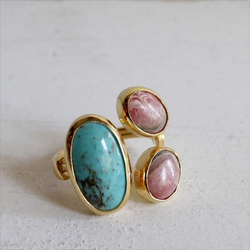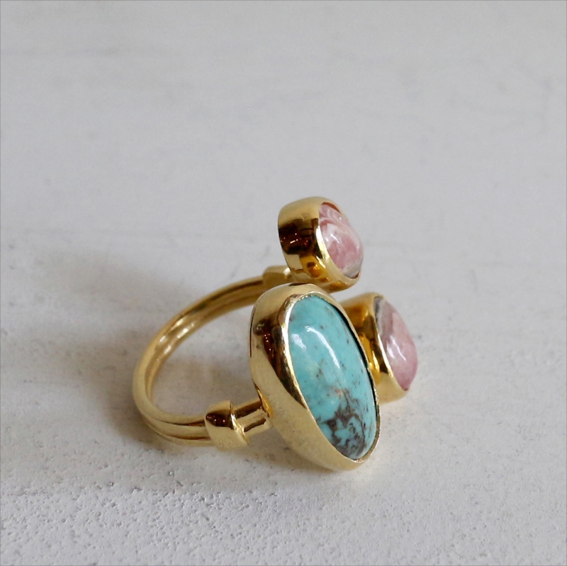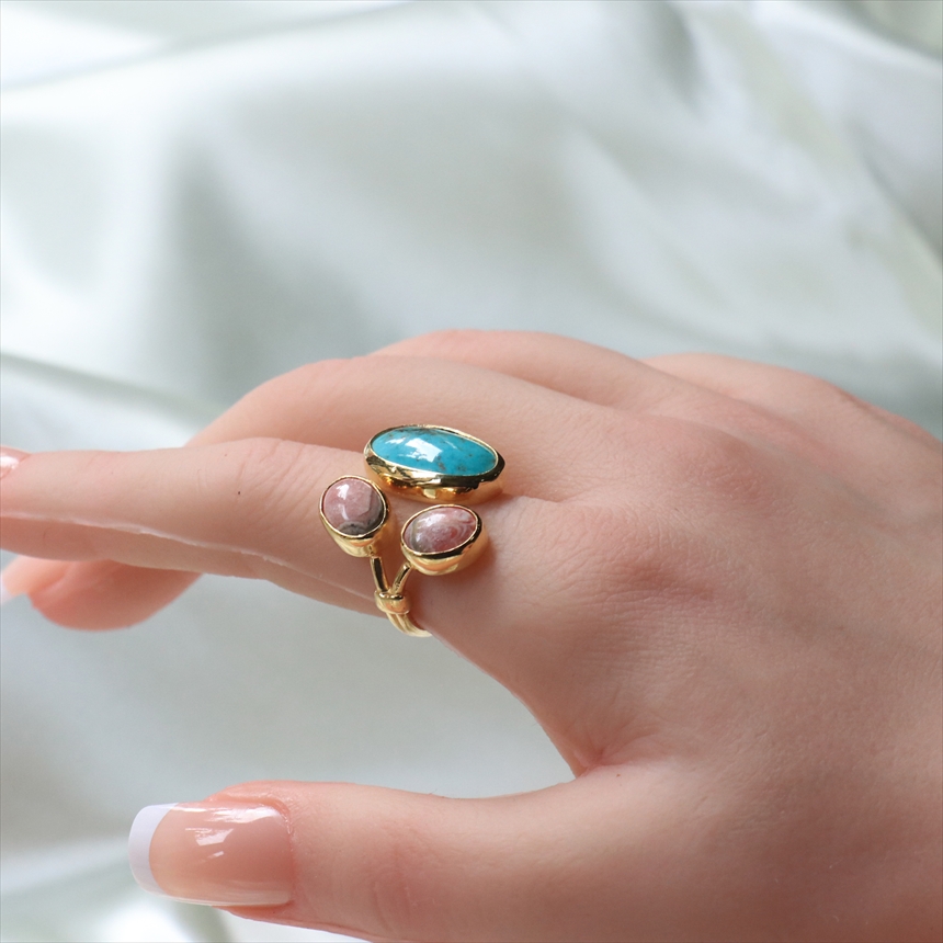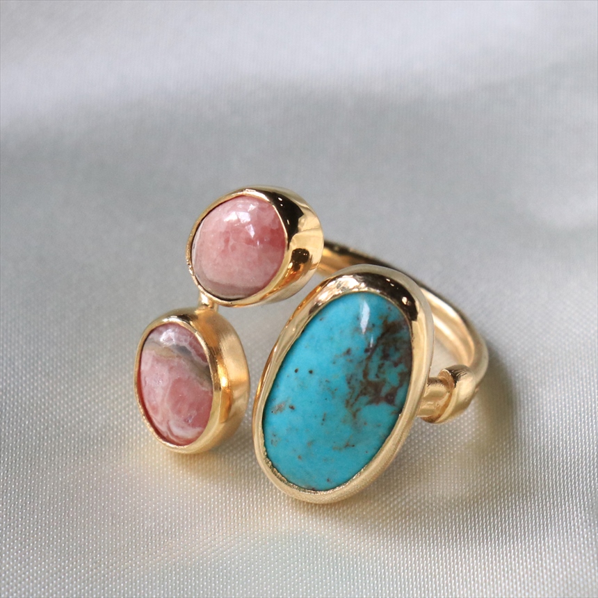 大きめのオーバルカットのターコイズと、カボションカットのコロンとしたロードクロサイトが寄り添うようについたデザインのリングです。赤みのあるピンクカラーのロードクロサイトが全体に温かみを与えてくれています。※大きいターコイズ1.7×1cm