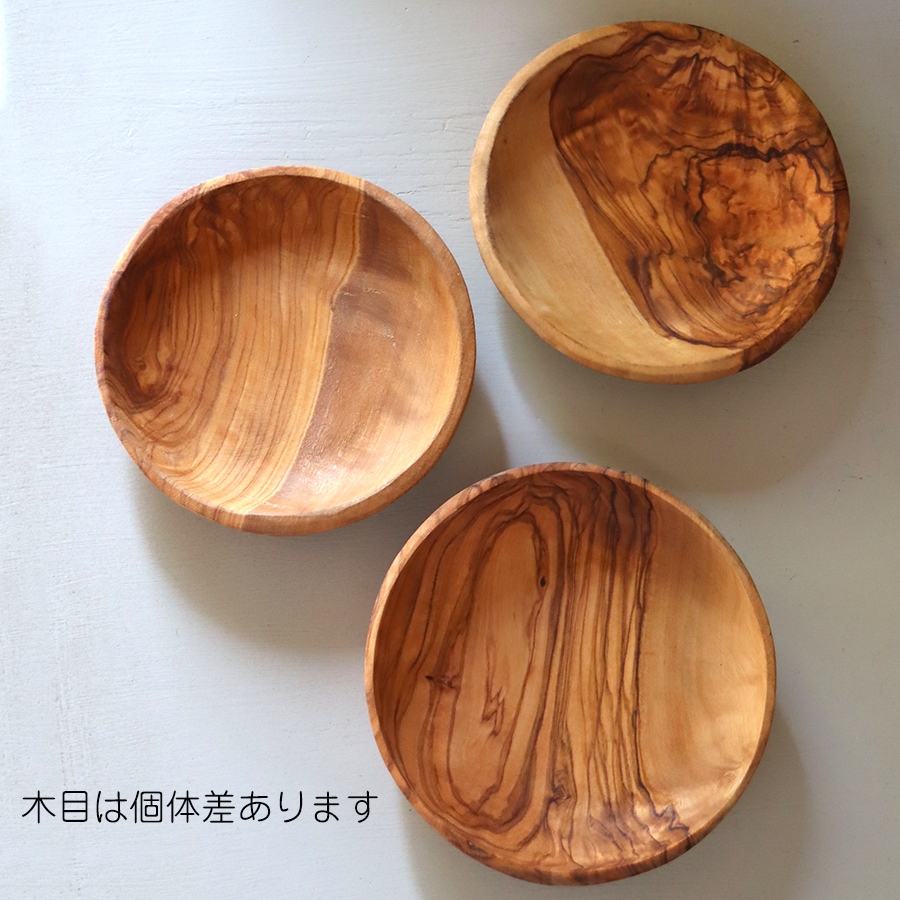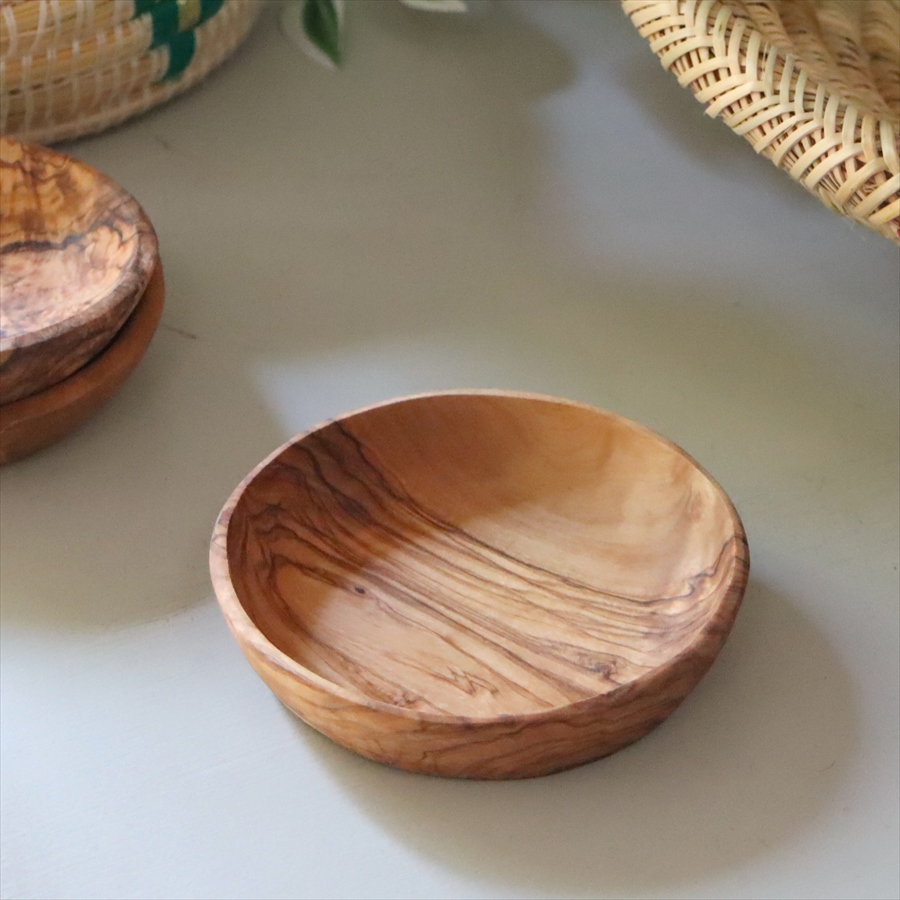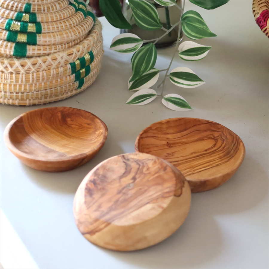オリーブの木の美しい木目を生かした、木の小皿です。使いやすいサイズの大中小をご用意しました。お菓子入れや豆皿として重宝します。そのままテーブルに出してつかえます。