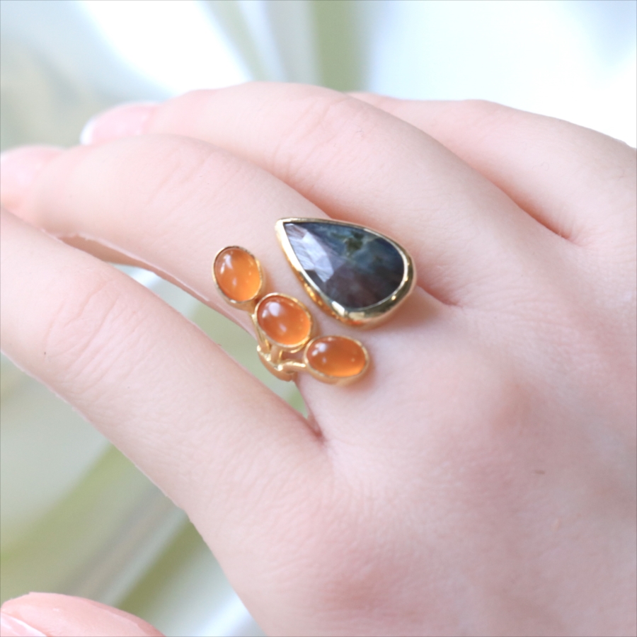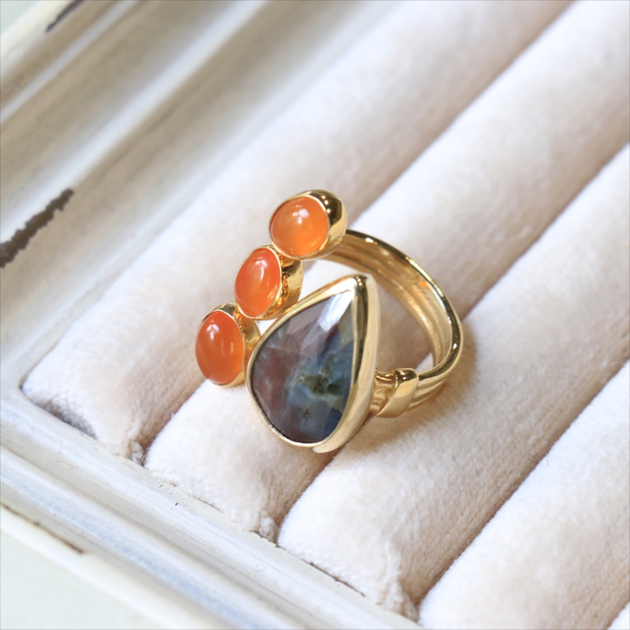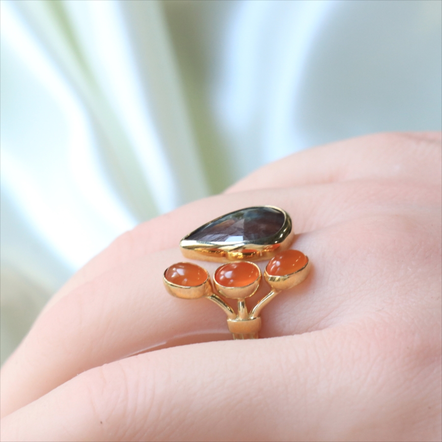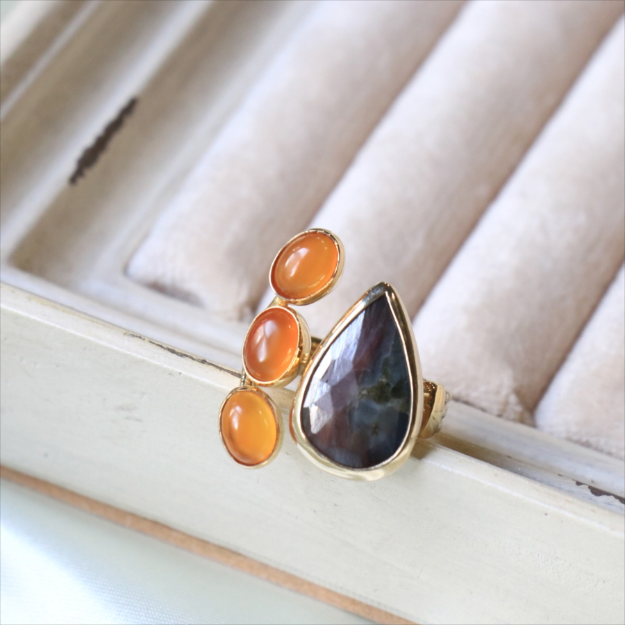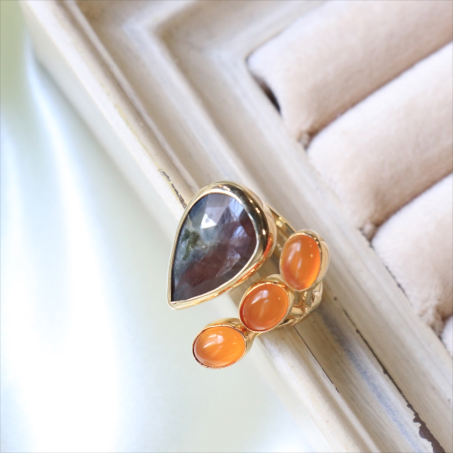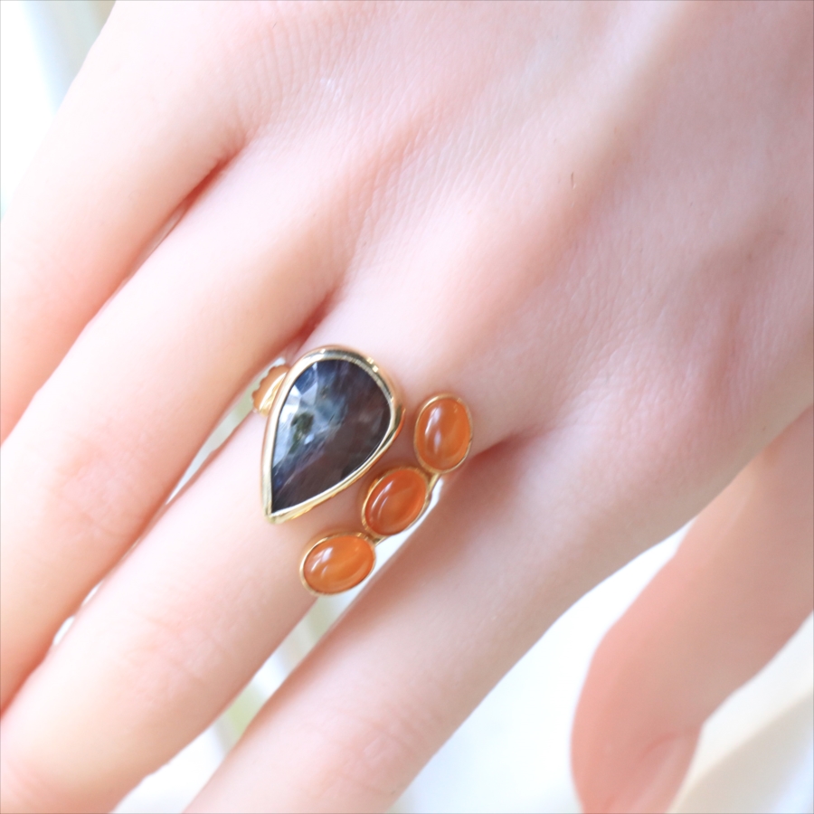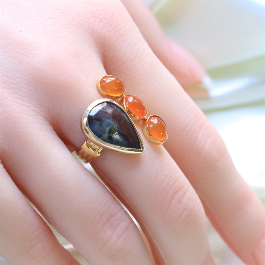 ボルドー、ブルー、深いグレーにやわらかな白い結晶がにじんだような色味が美しいサファイア。かわいらしいサイズのカボションカットのカーネリアンが三つ寄り添うようについたデザインのリングです。絶妙なニュアンスカラーが上品さを引き出します。それぞれの石は裏面が抜けているので、光を透す仕様になっています。。※サファイア1.8×1.1cm