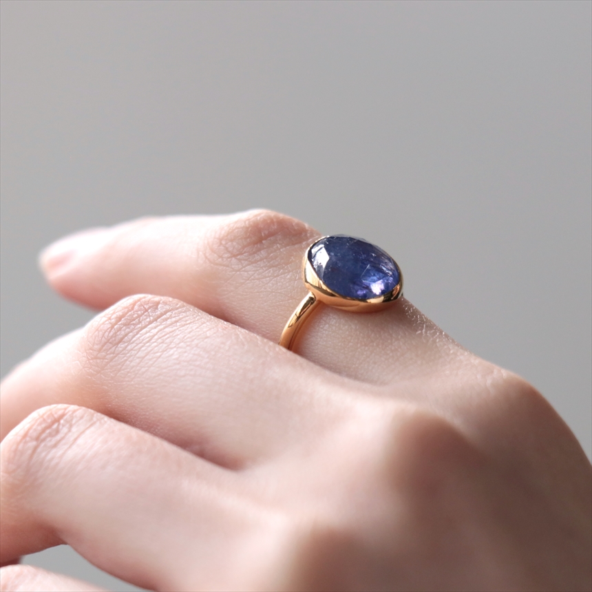 青紫や群青色、見る角度によって、グリーンやピンクなど様々な色彩の混じりあうブルーカラーが大変美しい石、タンザナイト。華やかで存在感あるリングです。