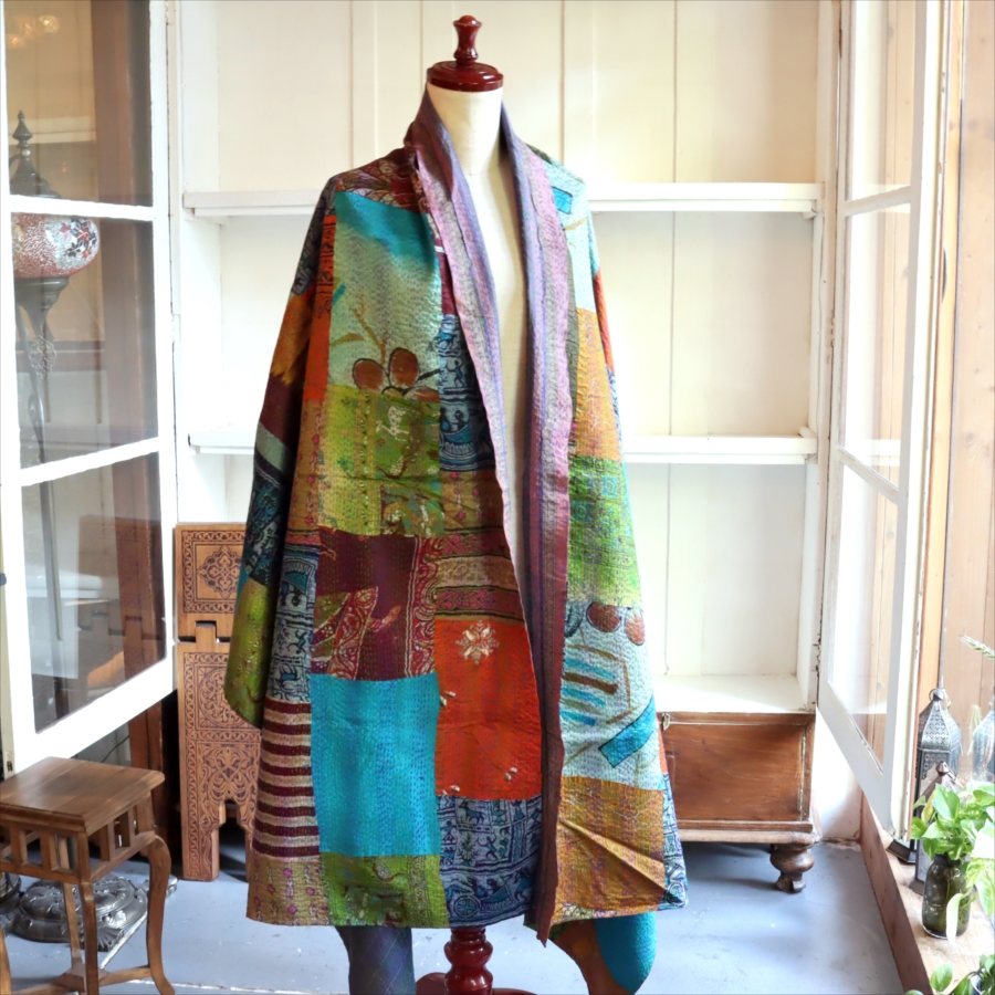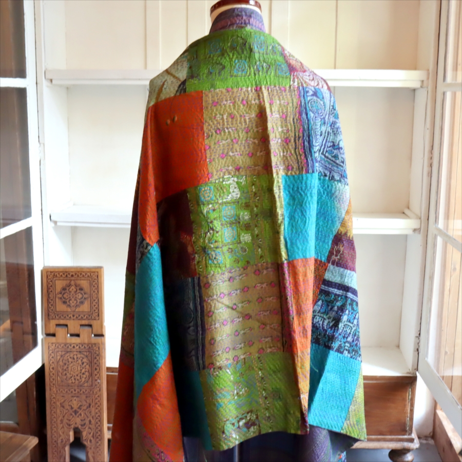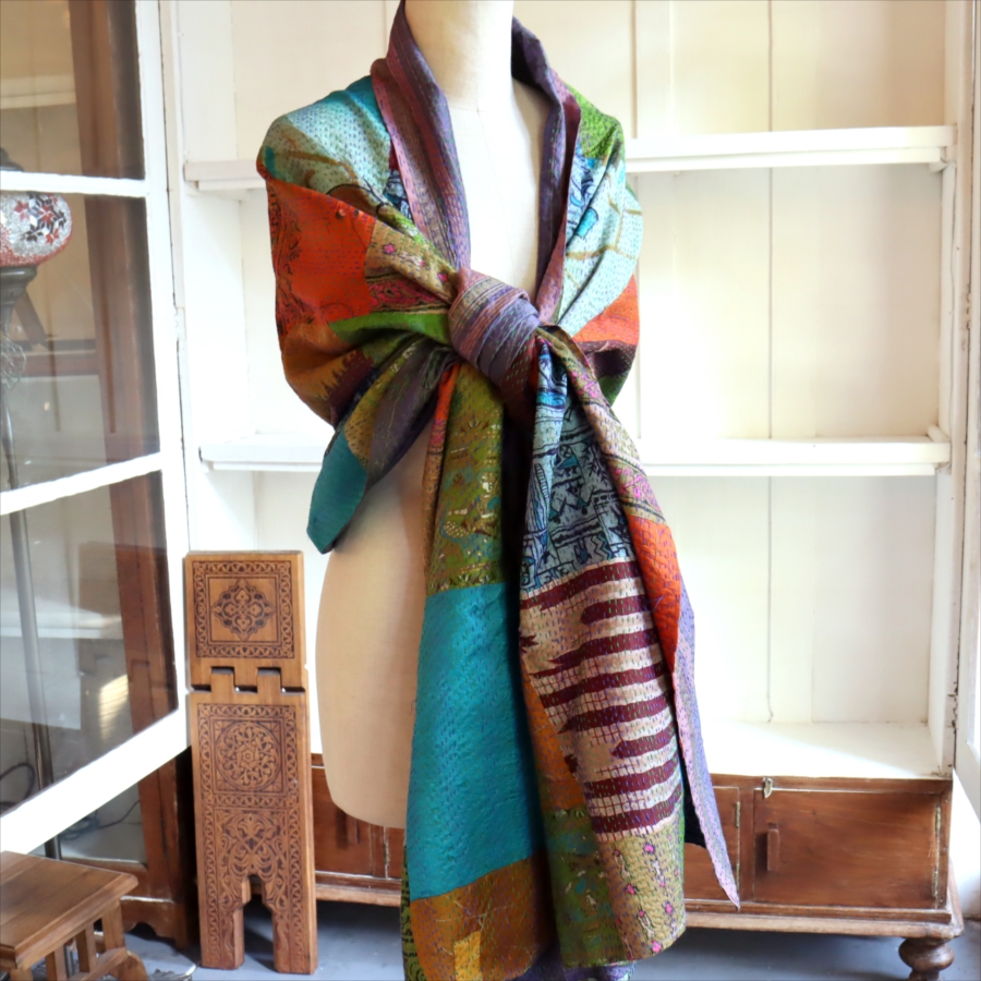 カンタ刺繍 シルクストール 大判224×89cm モザイク パッチワーク 【一点もの 現品】 Kantha embroidery, India
