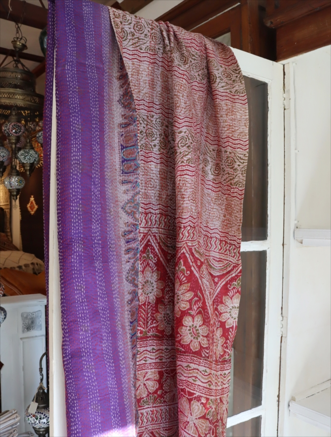 - カンタ刺繍 シルクストール インド リサイクルサリー 202×85cm 【一点もの 現品】 大判ストール