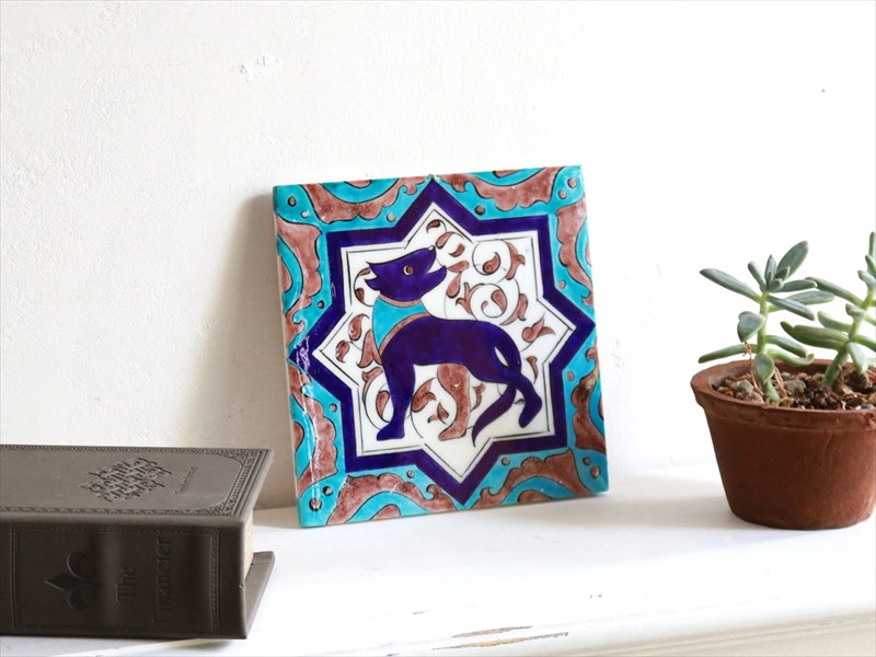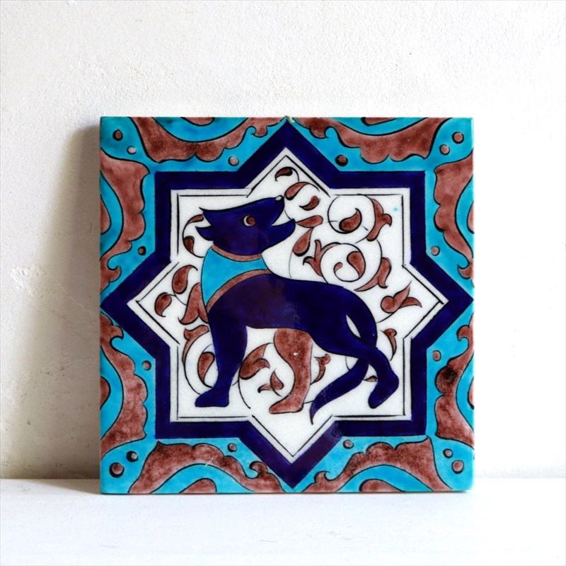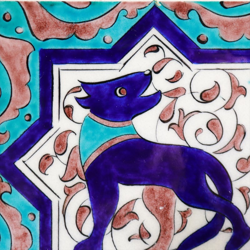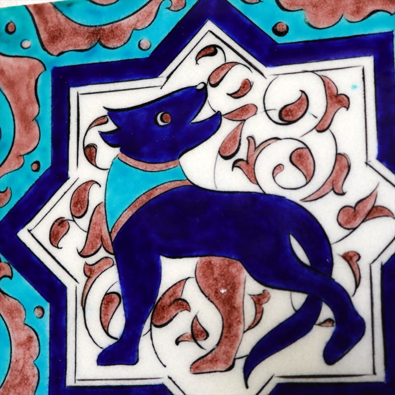 八角形の星型に動物が描かれたこのタイルのデザインは、13世紀ルーム・セルジューク朝の首都コンヤに残されているタイルを元にしたもので、中央アジアやペルシャの影響も見られるユニークなものです。
