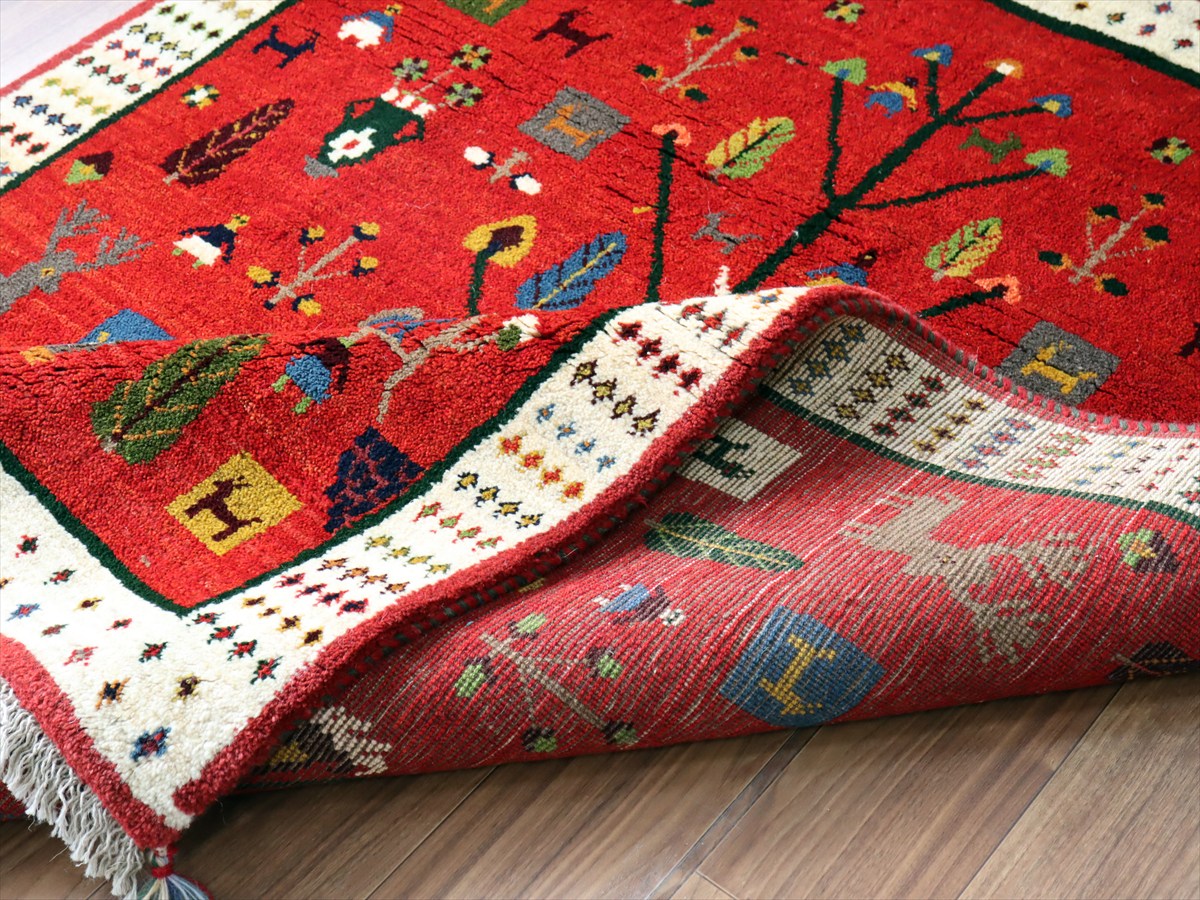 - ギャッベ イランの手織りラグ192×149cm レッド 生命の樹と様々なモチーフ