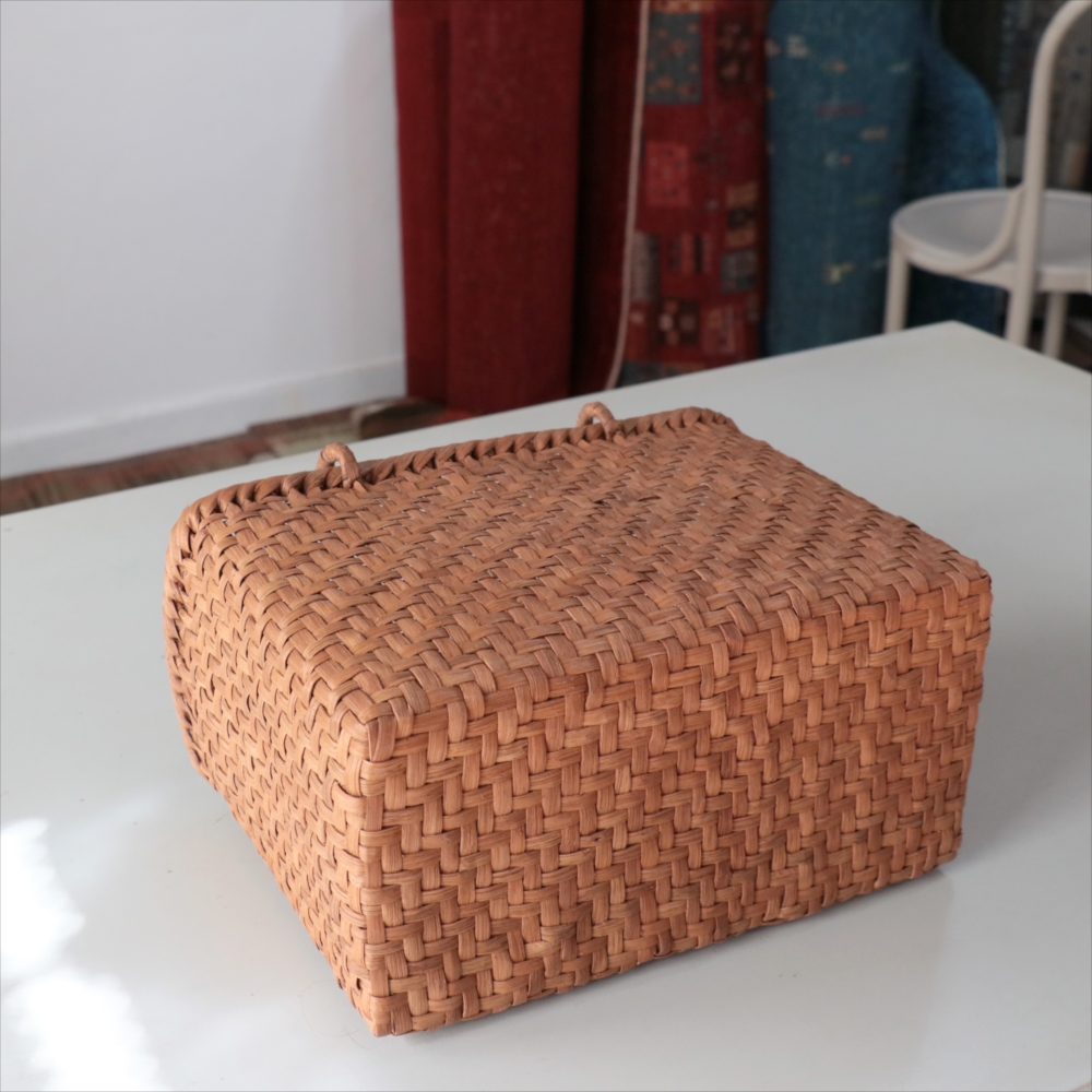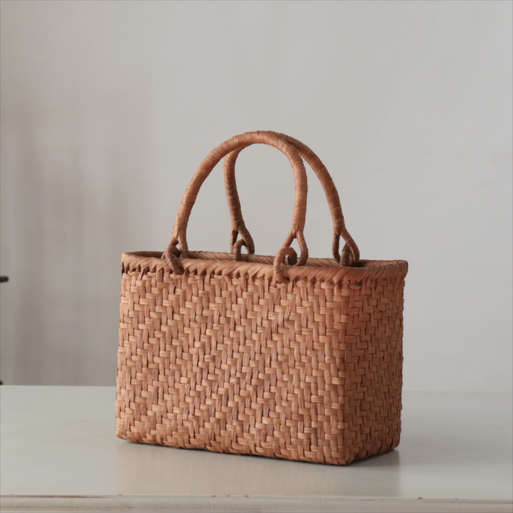 しっかりと厚みのある四角い箱のような形のかごバッグです。リング手は座って膝にのせた時などに折りたためて、持ち手がじゃまにならず使いやすいのでおすすめです。