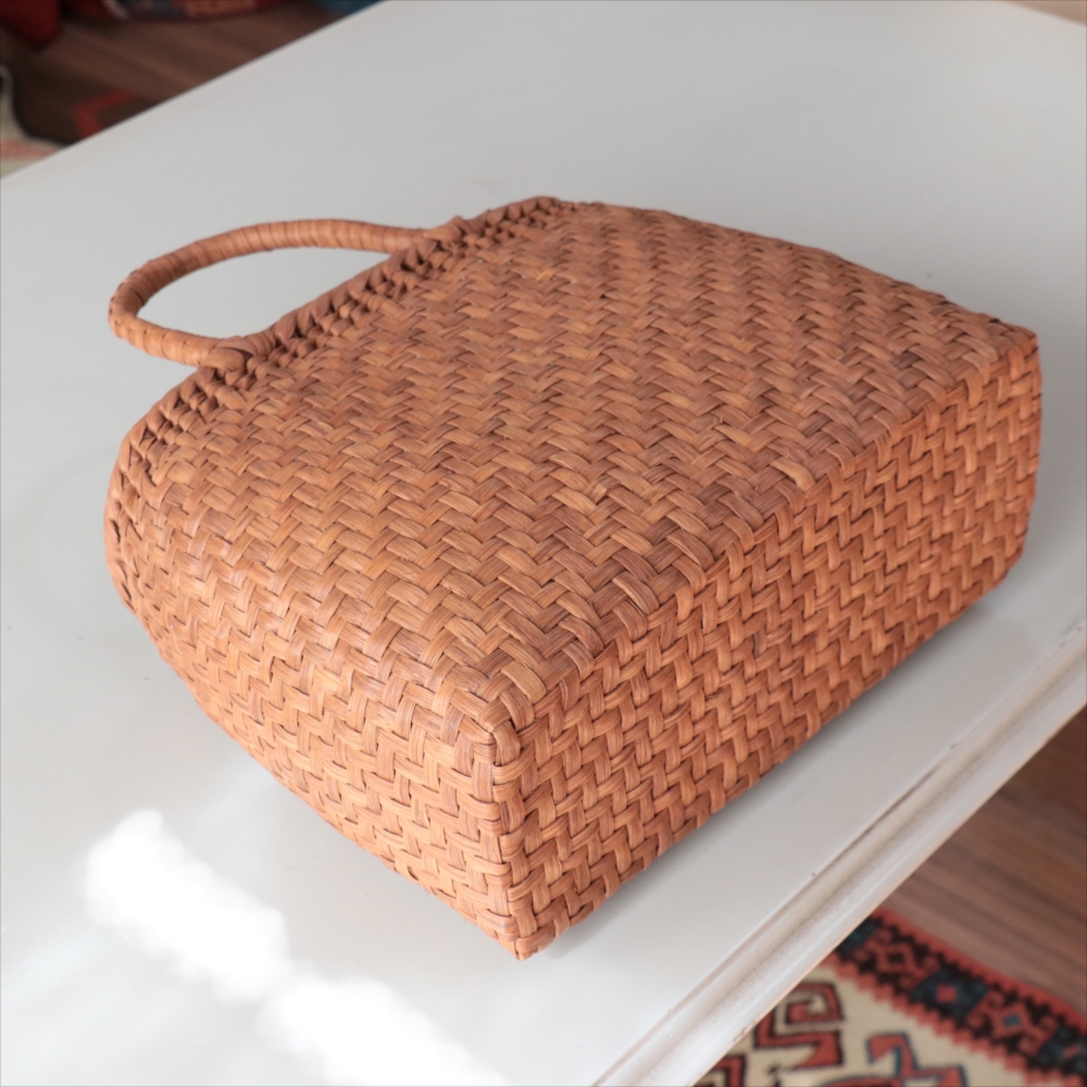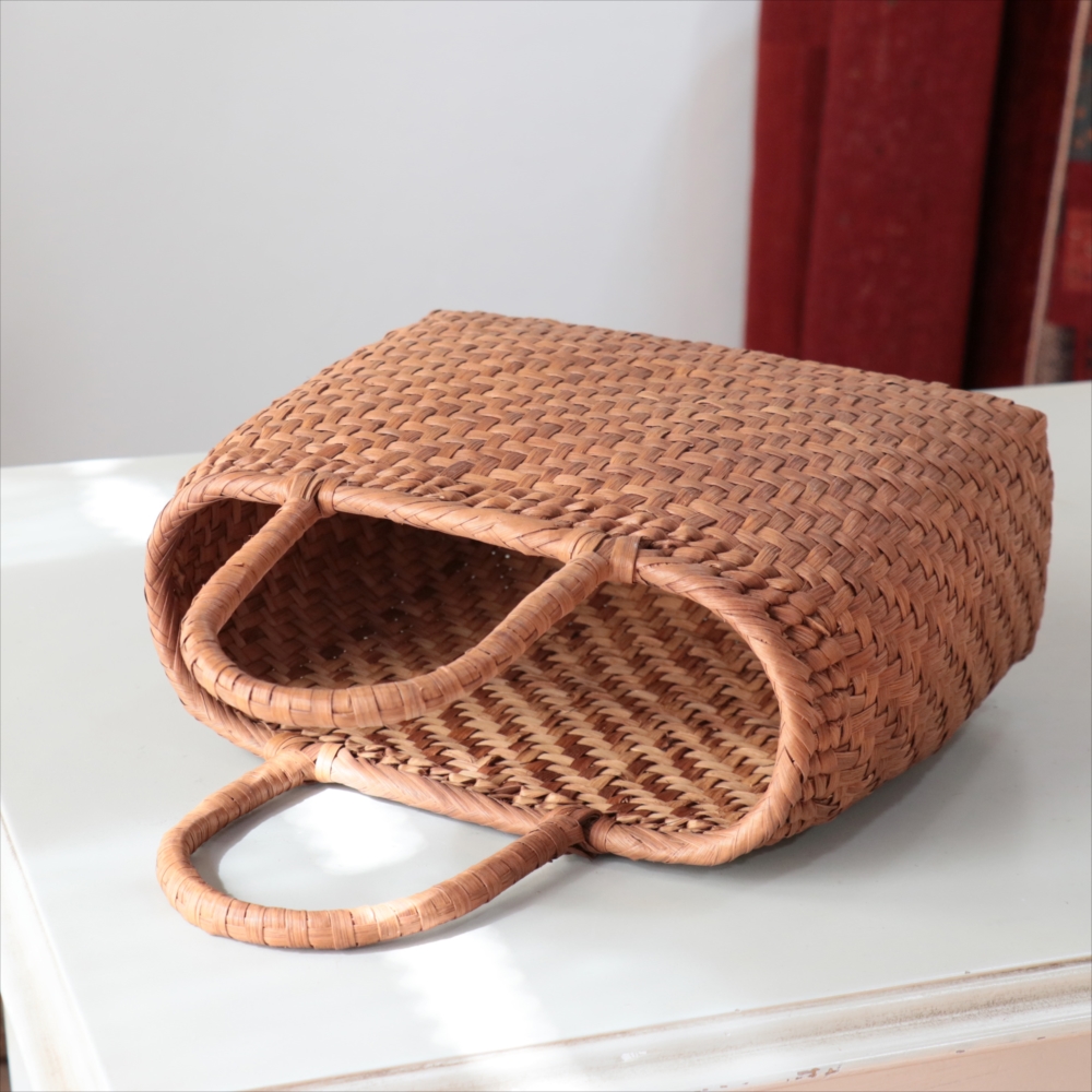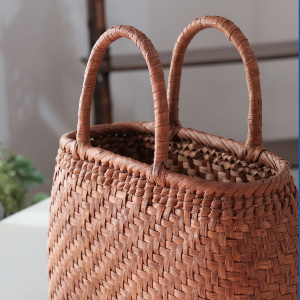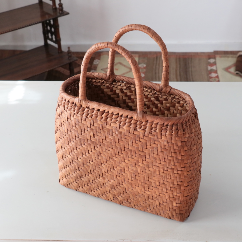 まるみのあるきれいなラインのカゴバッグ。シンプルな網代編みです。高さがあってマチも広めなので、普段使いに活躍できるかごバッグです。やまぶどうの蔓の表面を削って整え、滑らかに仕上げています。山ぶどうのかごバックは、最初は少し赤みのある明るい茶色で、使い込むほどに艶が出てこげ茶色の味わい深い質感に変わってゆきます。その変化もお楽しみください。