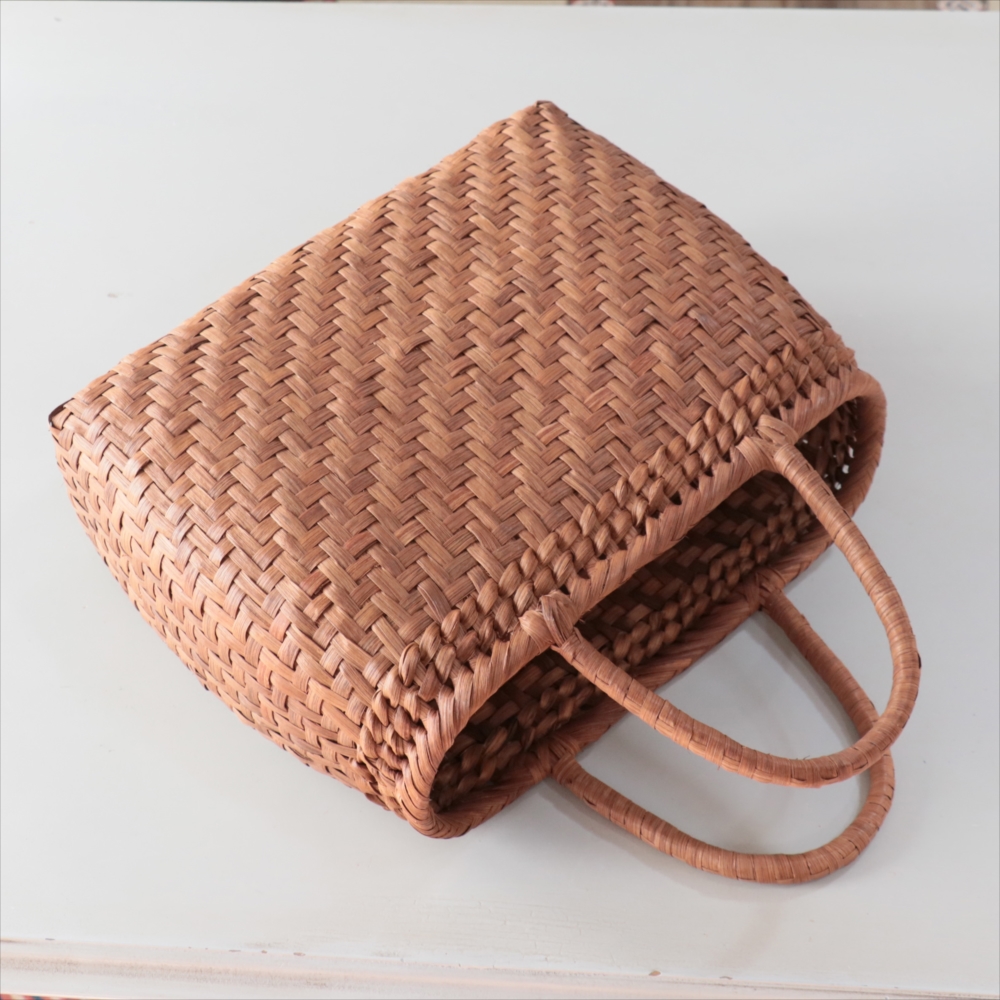 まるみのあるきれいなラインのカゴバッグ。シンプルな網代編みです。高さがあってマチも広めなので、普段使いに活躍できるかごバッグです。やまぶどうの蔓の表面を削って整え、滑らかに仕上げています。山ぶどうのかごバックは、最初は少し赤みのある明るい茶色で、使い込むほどに艶が出てこげ茶色の味わい深い質感に変わってゆきます。その変化もお楽しみください。