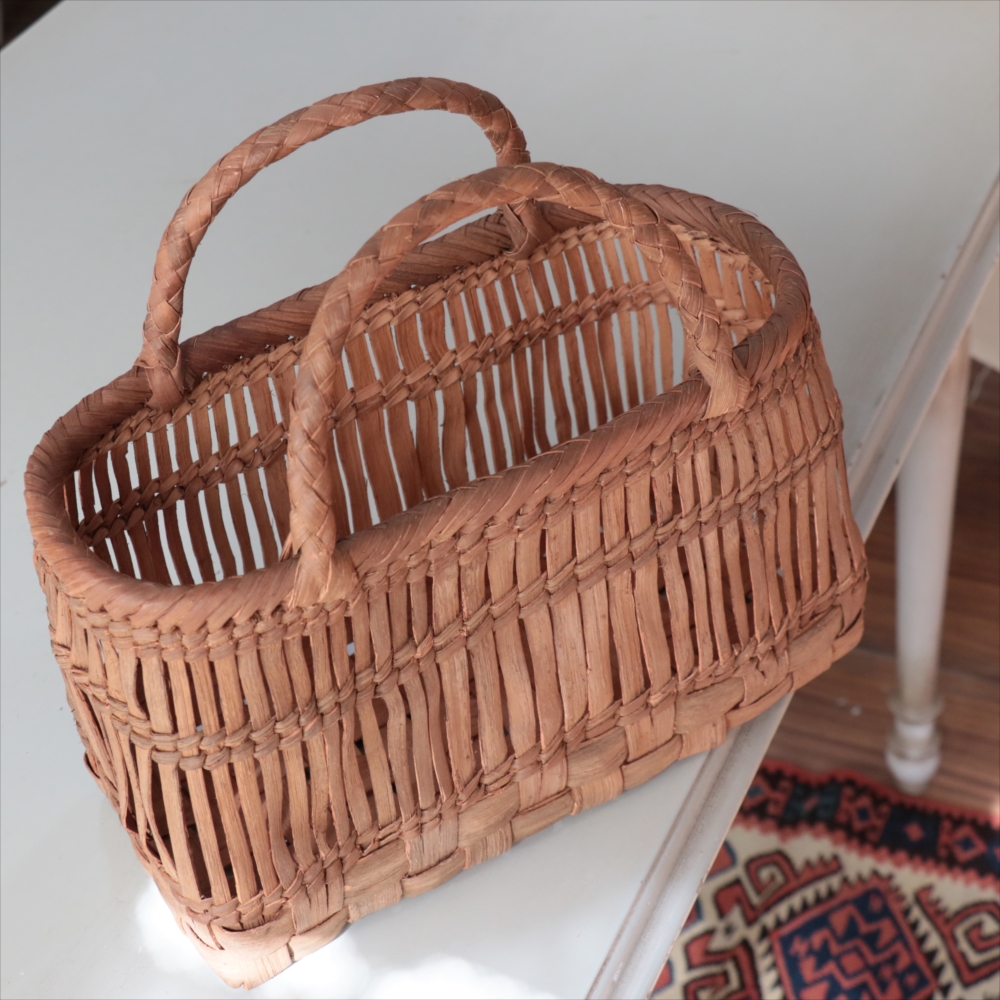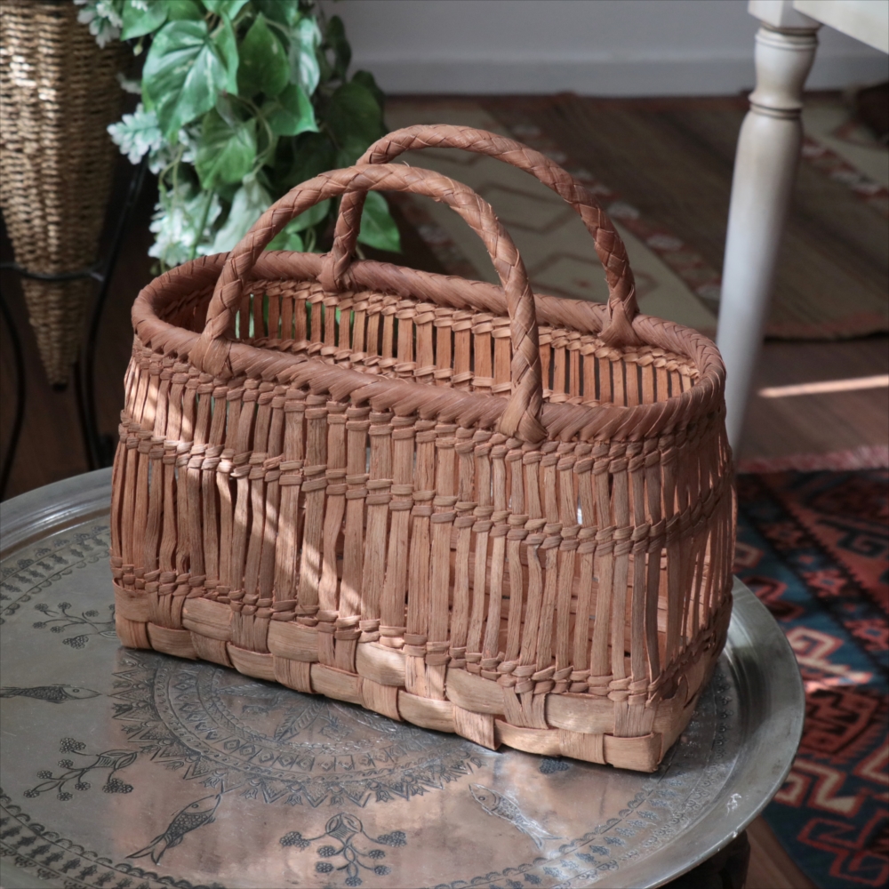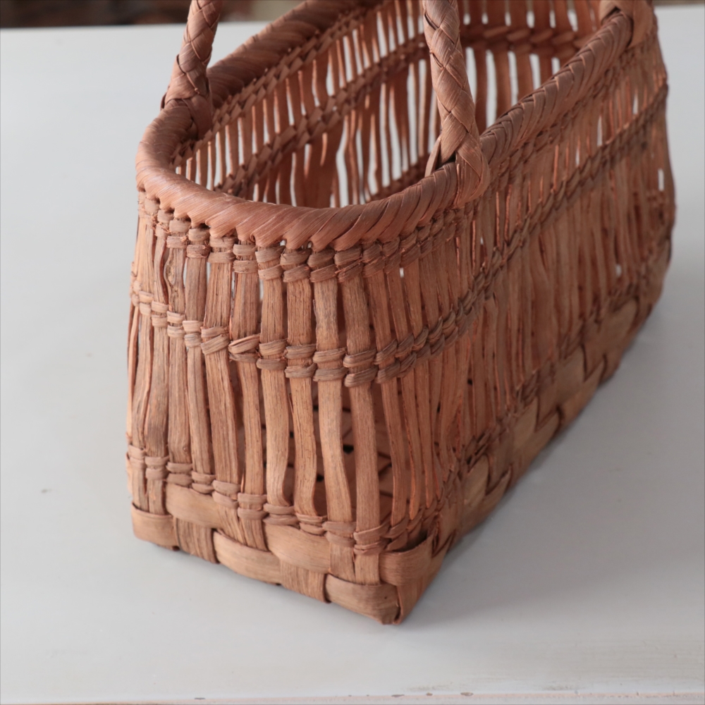 山葡萄の蔓の素材感が、存分に楽しめる透かし棚編みのかごバッグです。やまぶどうの蔓がちょっと曲がっているところや、節など、表情のゆたかな仕上がりです。