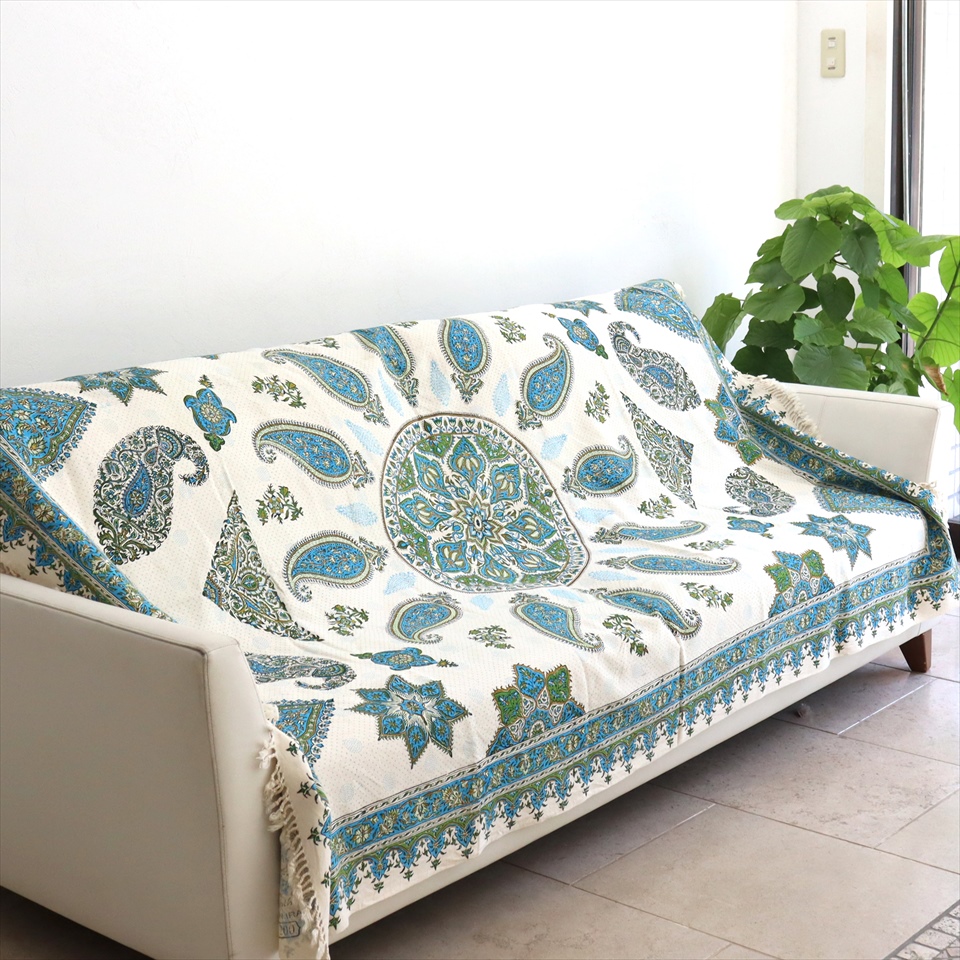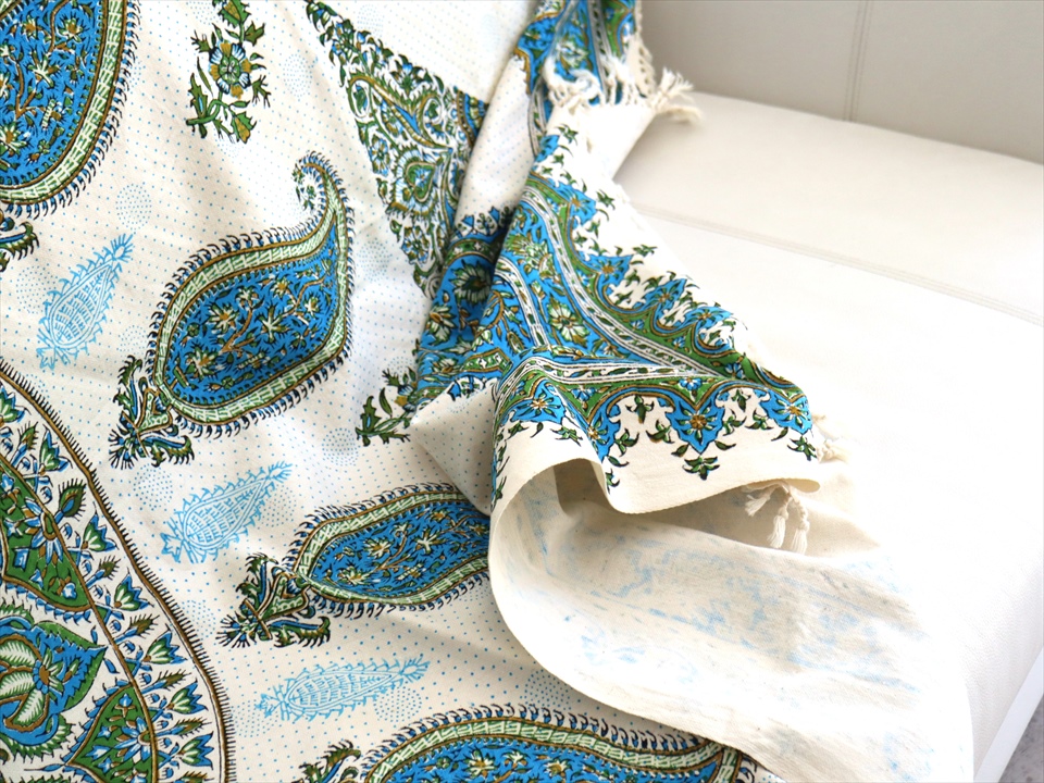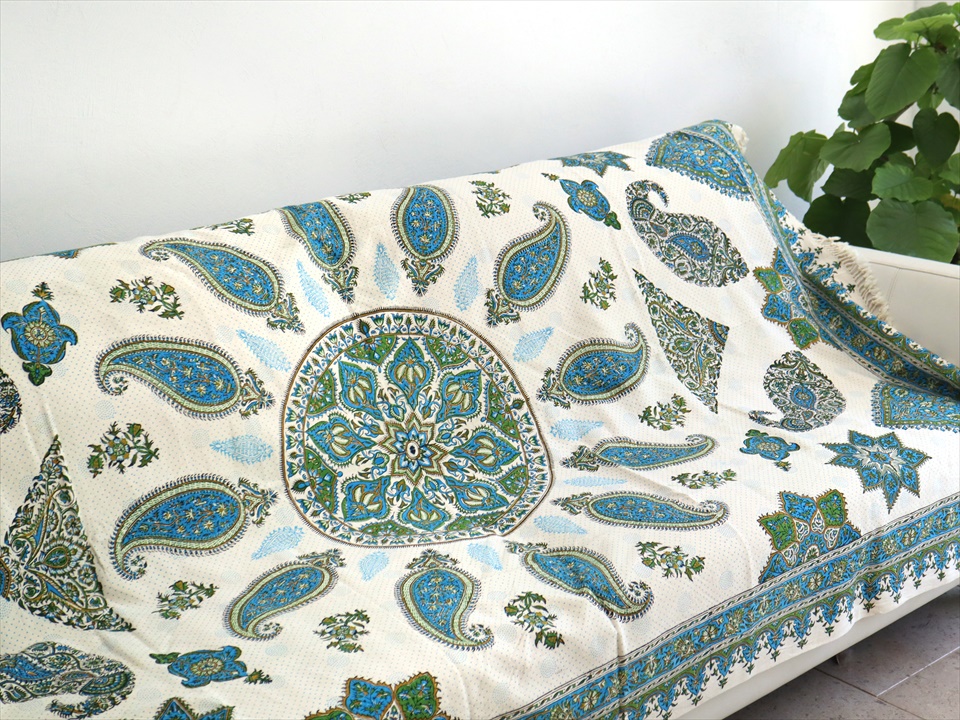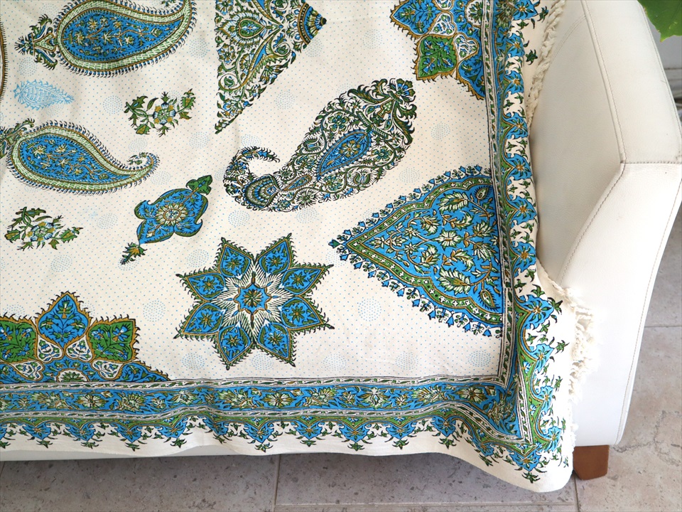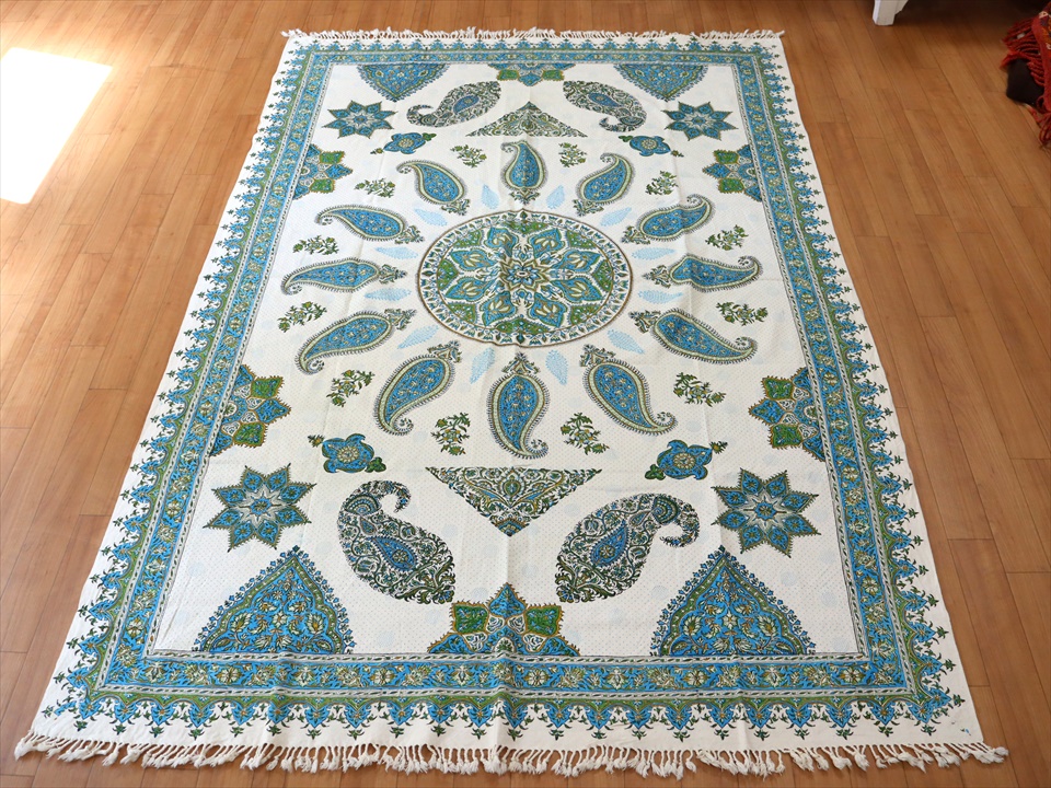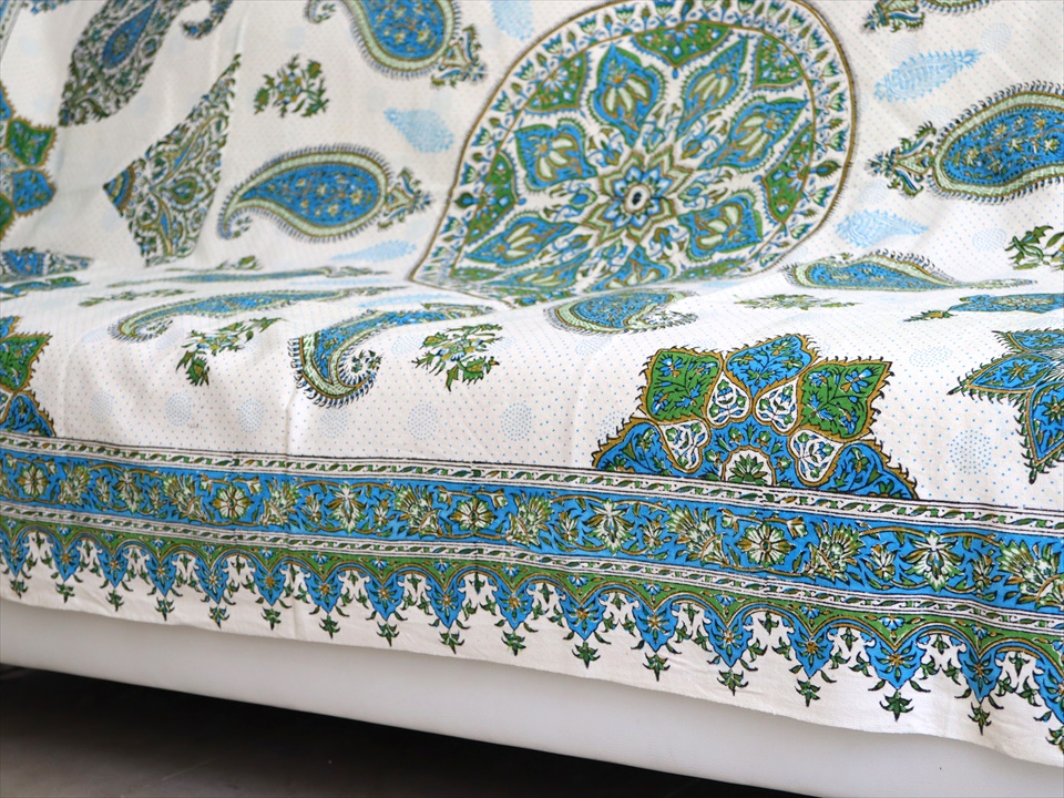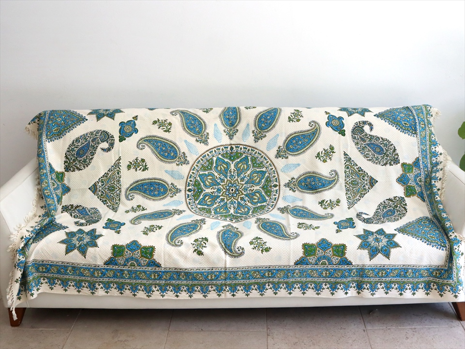 ペルシャ更紗 イラン手染め布 200x135cmサイズ グリーン系 ペイズリー柄 テーブルクロス ソファカバー