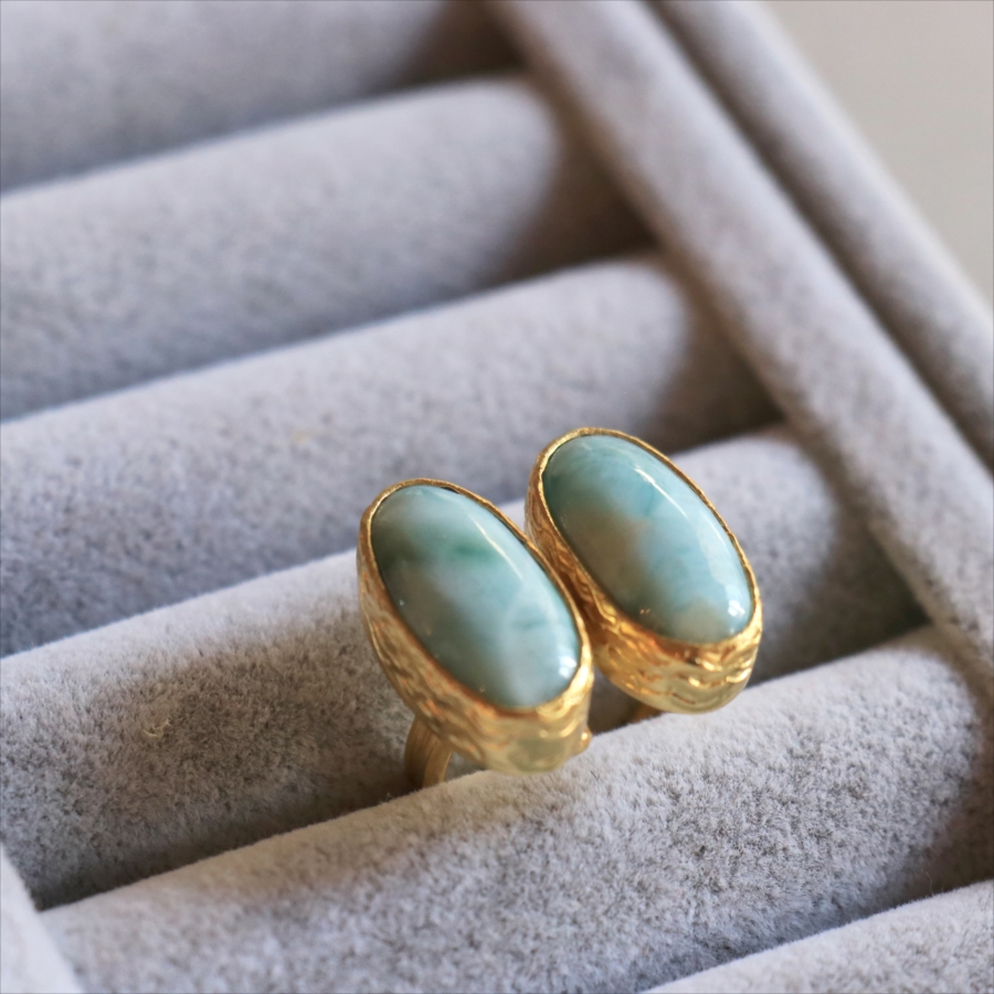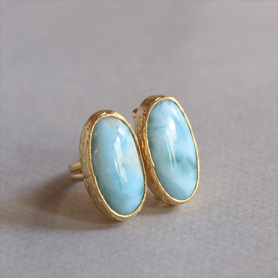 海に映る雲のような模様が広がる、優しいブルーが美しいラリマーダブルリングです。双子のように並ぶオーバルのラリマー。シンプルながらも個性的が光る一点ものジュエリーです。