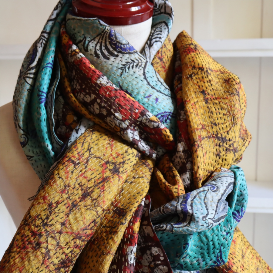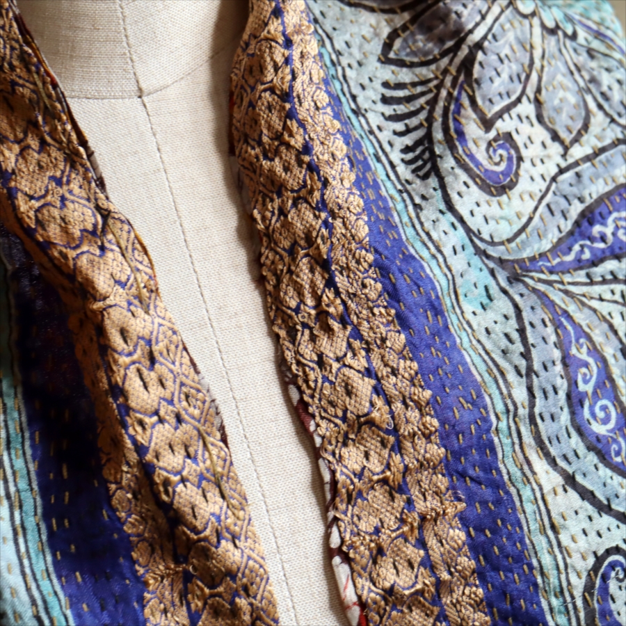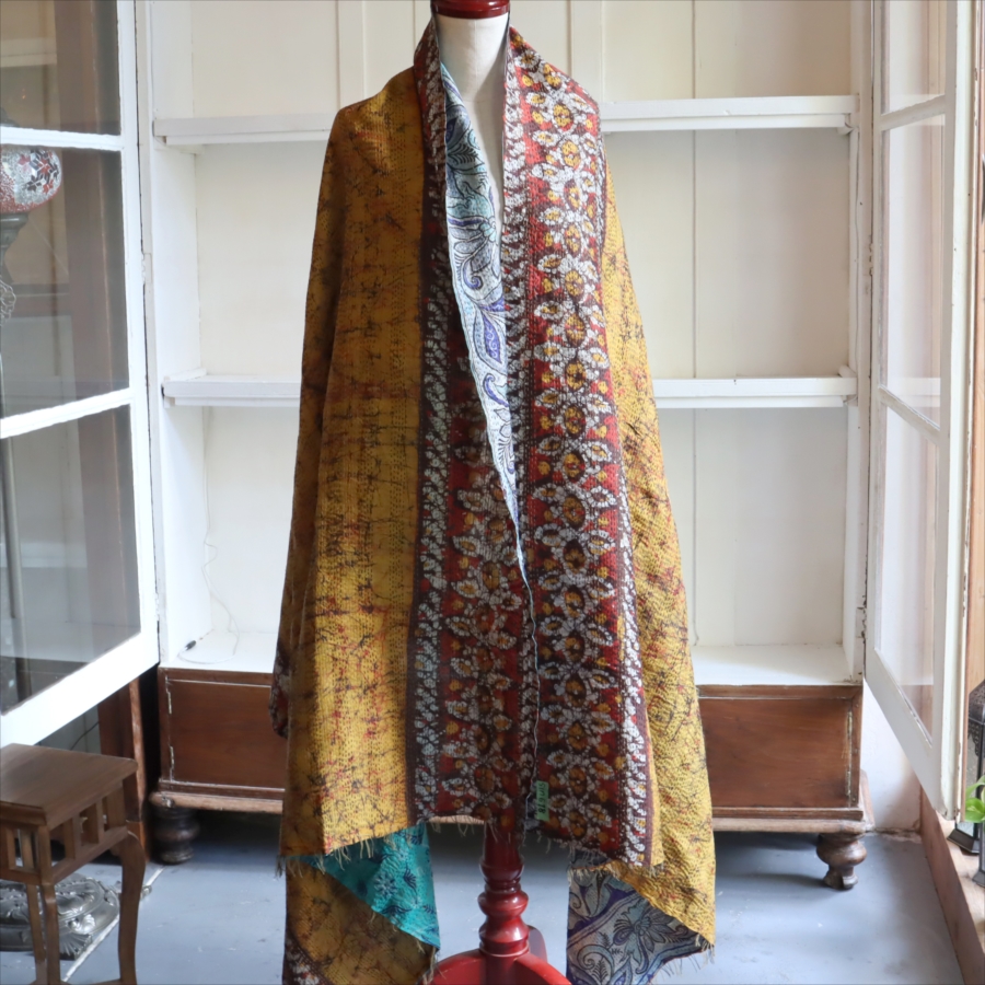 - カンタ刺繍 シルクストール Kantha embroidery, India 217×96cm 【一点もの 現品】大判サイズ 幅広