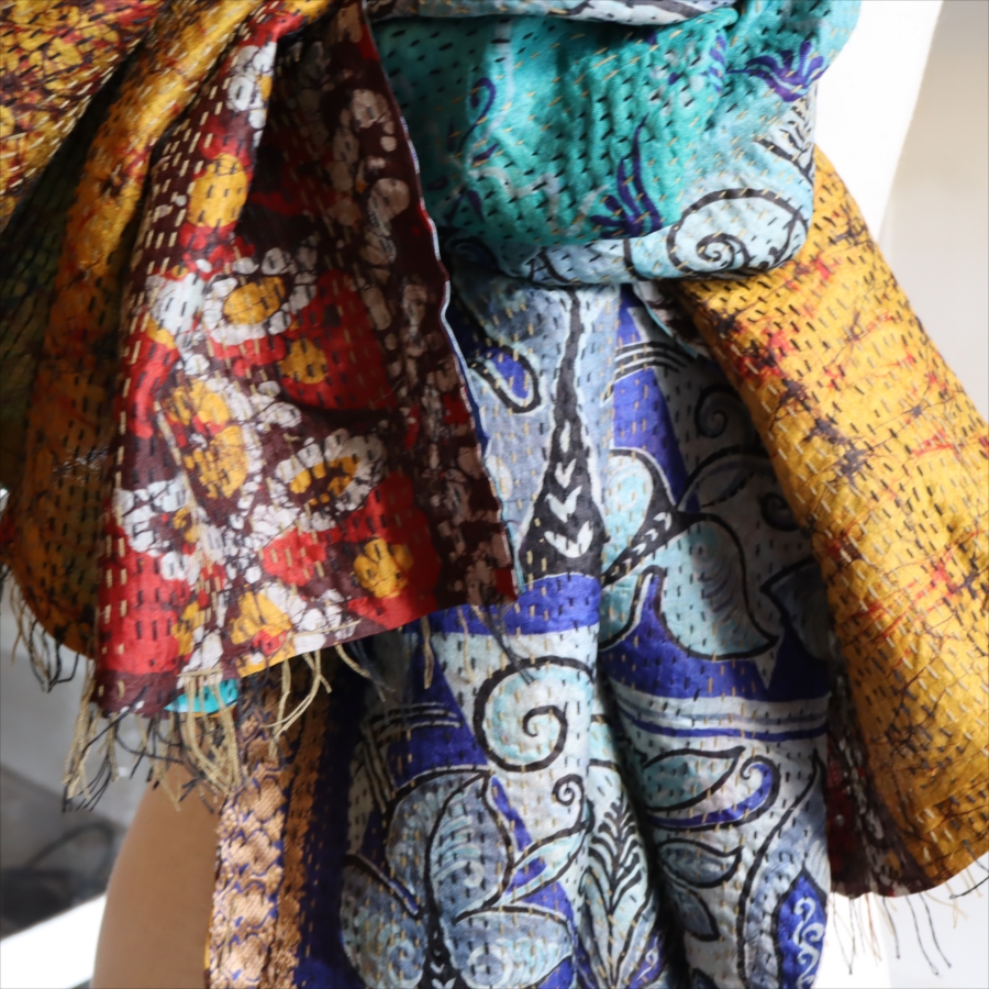 カンタ刺繍のシルクストールです。シルクの光沢感、布地の色柄とビビットな刺繍が個性的な布。ベースのシルク地はサリー(女性の衣装)のリサイクルで、表と裏に違う色柄の布を合わせて手作業で縫い合わされています。表裏ともにシルクなので軽くてさらりとした肌触りです。