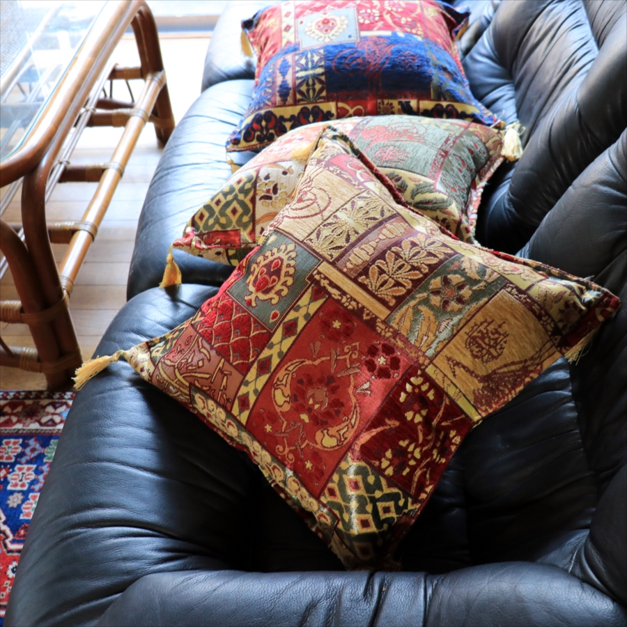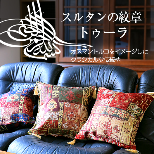 このスルタンの紋章をポイントに使ったエスニックなファブリックのクッションカバーです。ゴージャスなデザインで、ちょっぴりスルタンの気持ちが味わえます。
