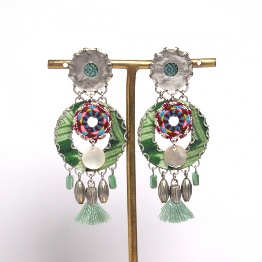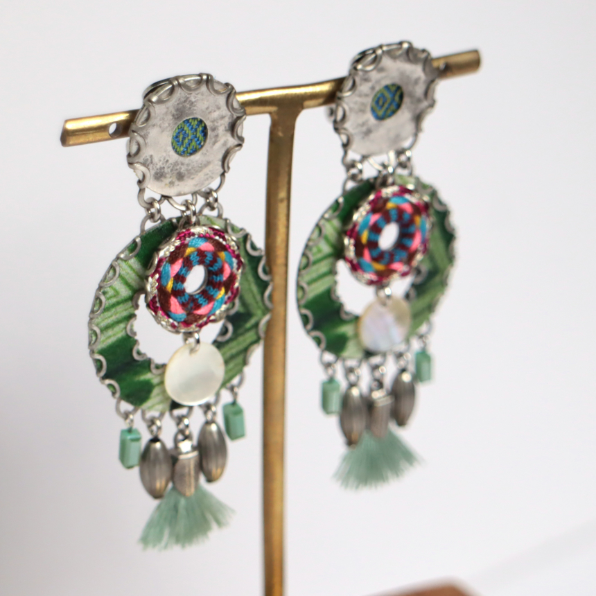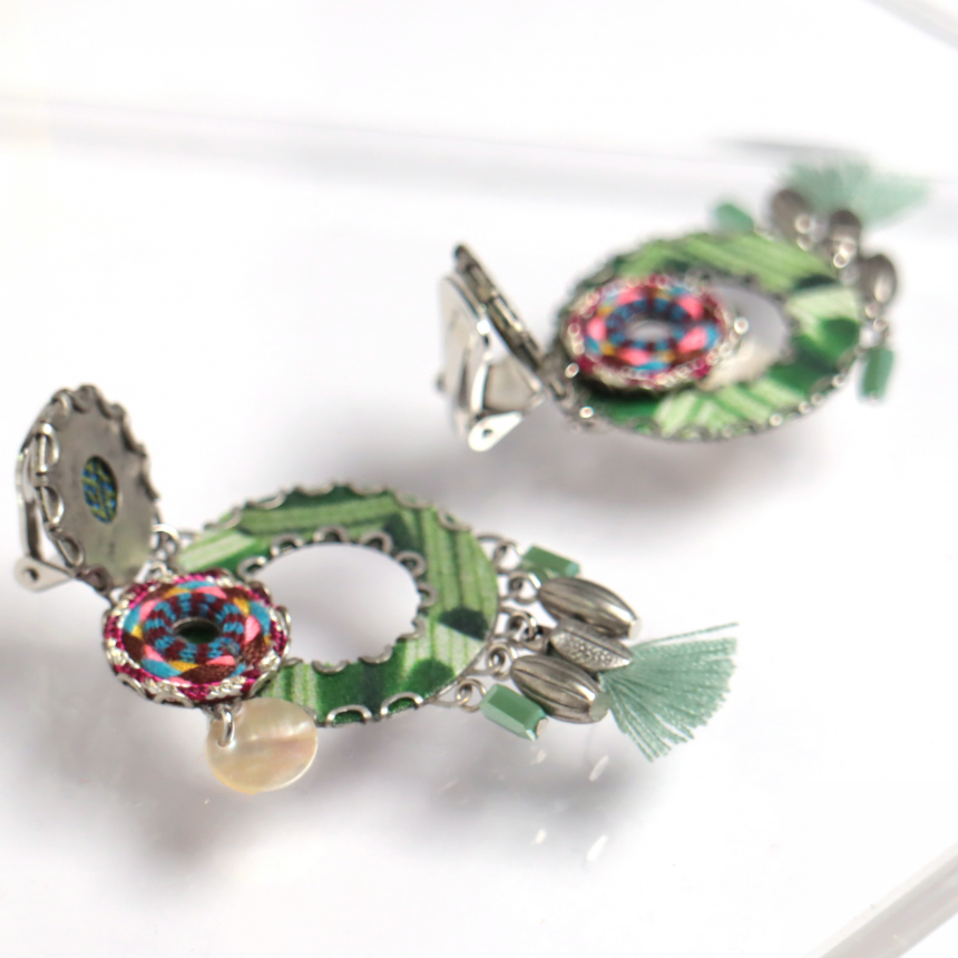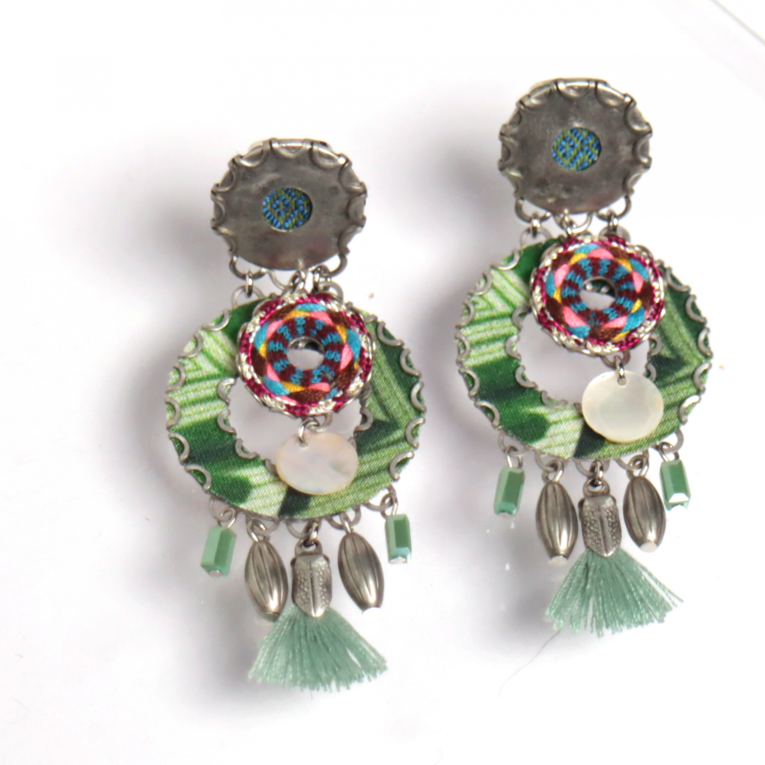 グリーンとピンク、二枚の明るい色のプリントファブリックプレートとシェルが重なる楽しいデザインのピアス。タッセルが付いているのもチャームポイントです。