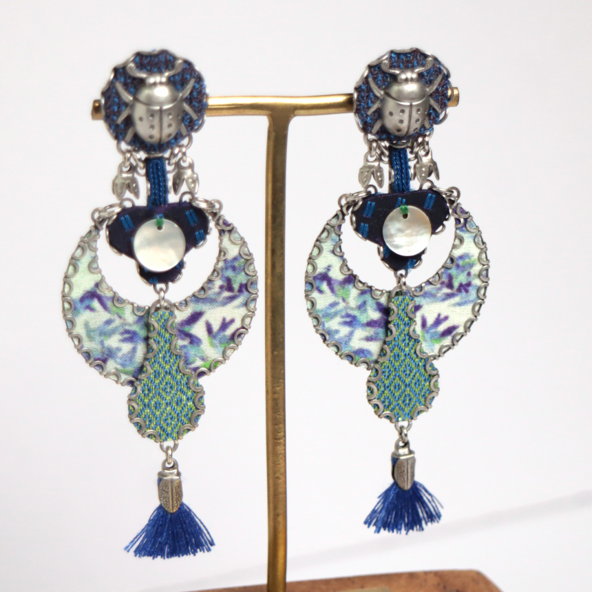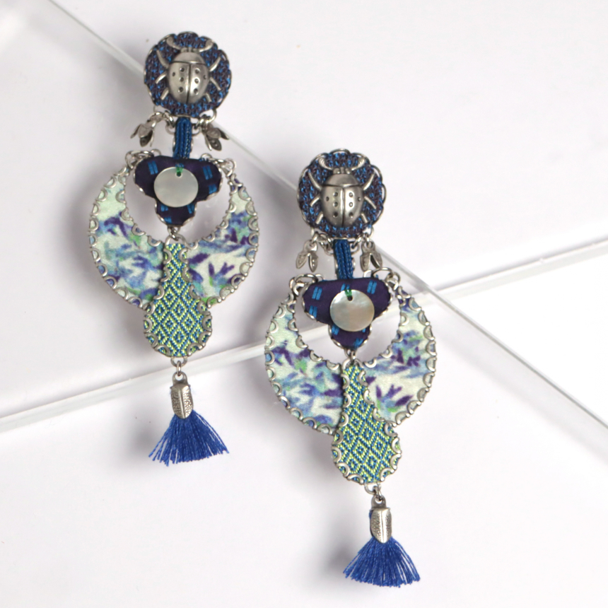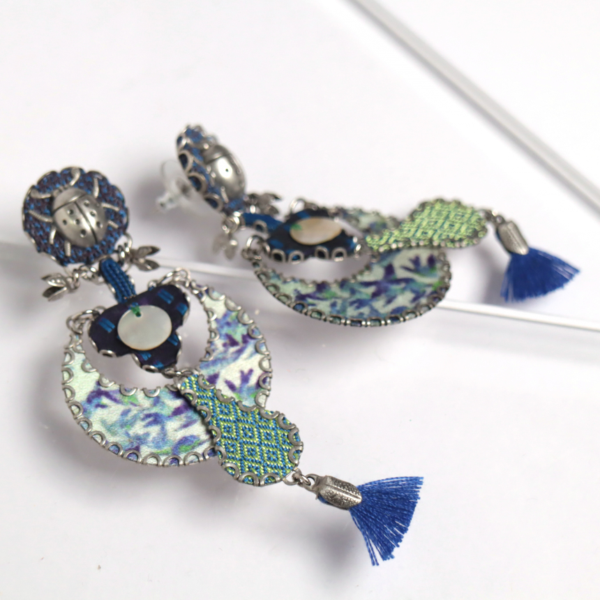 クールなトーンのプリントファブリックプレートとシェルが重なる楽しいデザインのピアス。テントウムシと、シェルパーツがアクセントになっています。タッセルが付いているのもチャームポイントです。