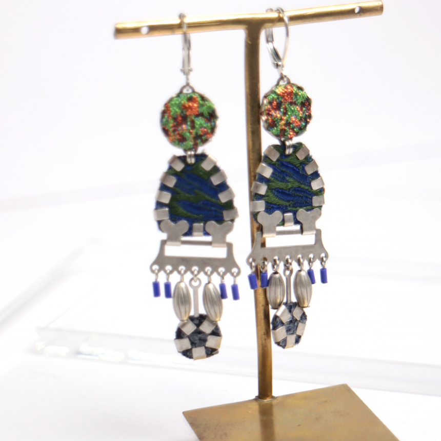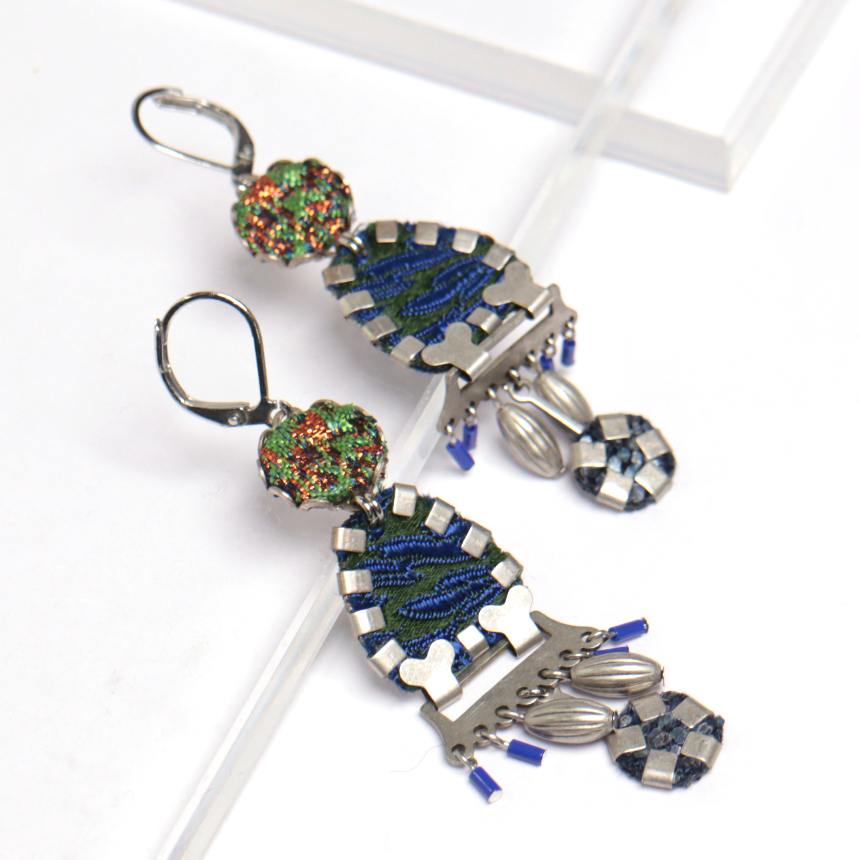 ヒップコレクションから、モスロックと名づけられたグリーンとブルーブラックのコンビネーションのピアス。グリーンのファブリックがモス(苔)のイメージですね。実際に手に取ってみると、手作りの細かなパーツの完成度の高さにきっとご満足いただけることと思います。