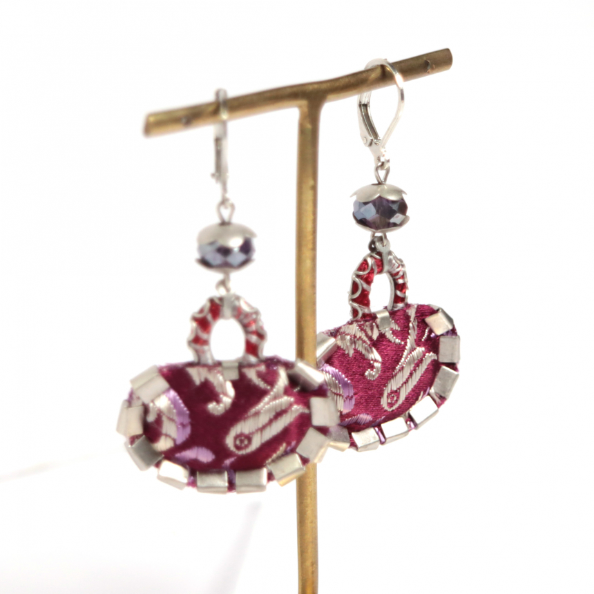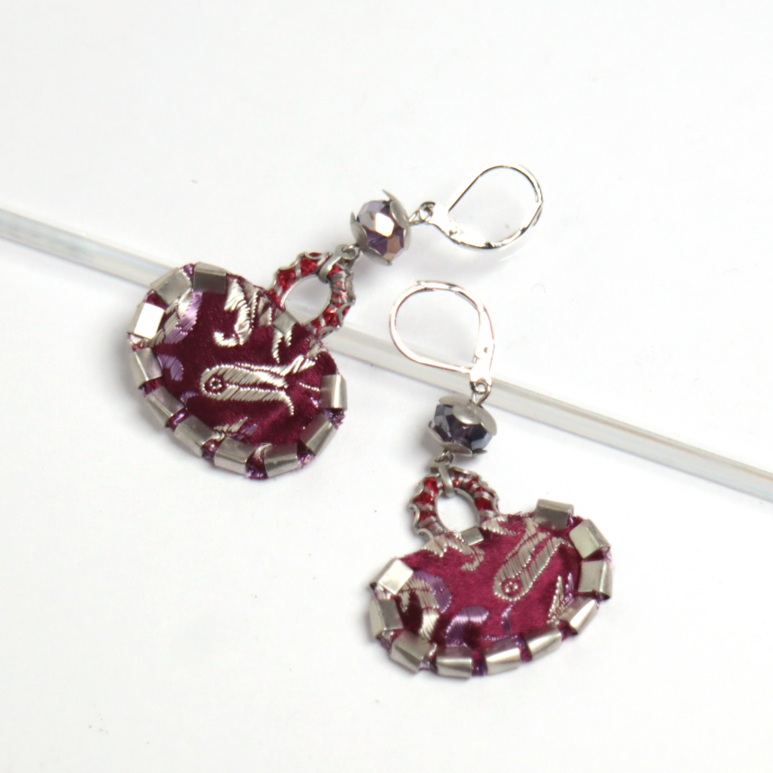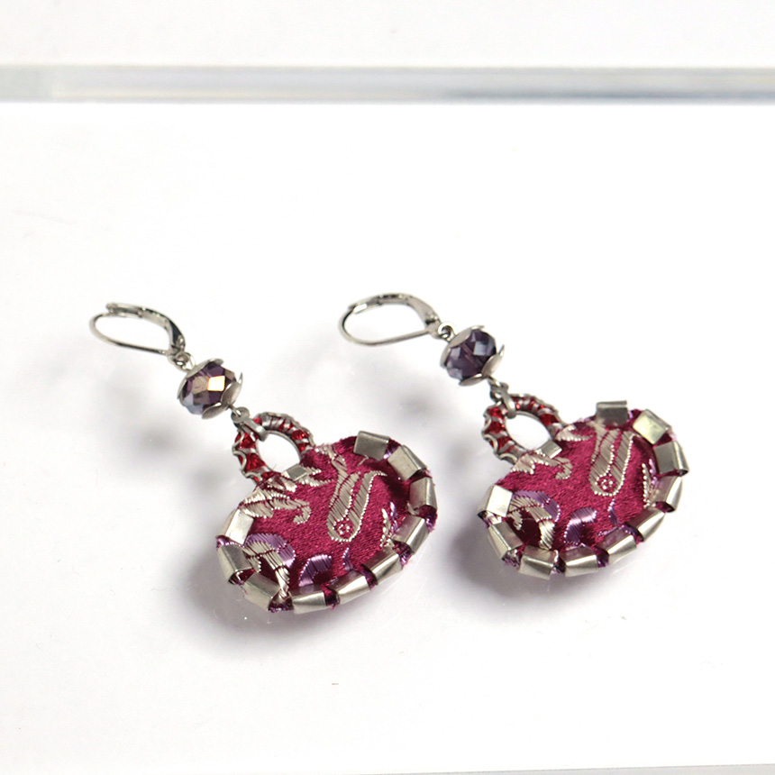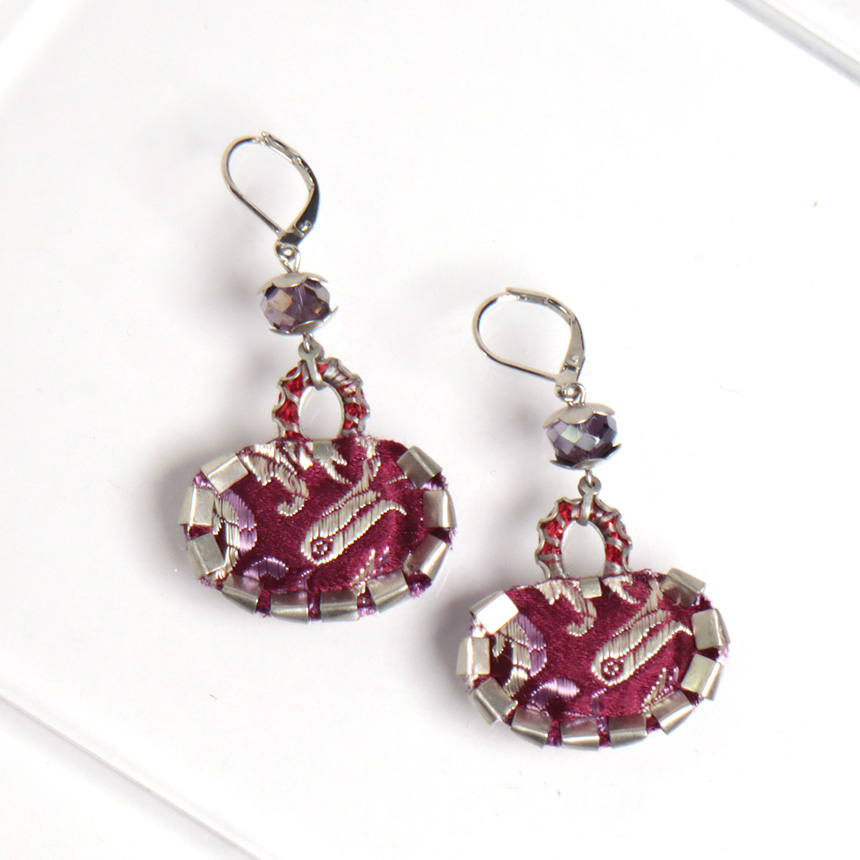 横長の楕円形パーツがかわいらしいヒップコレクションピアスです。ツヤのある刺繍のような織り地のファブリックパーツがとても繊細で、上品な印象。