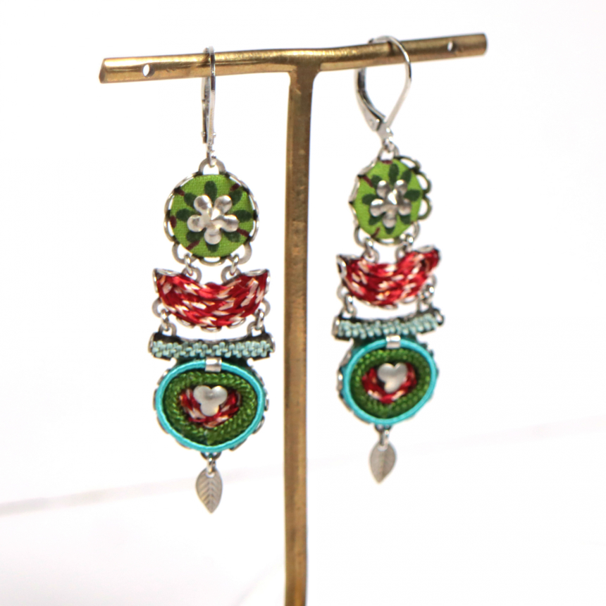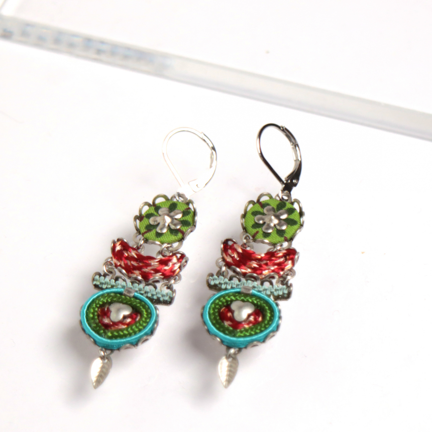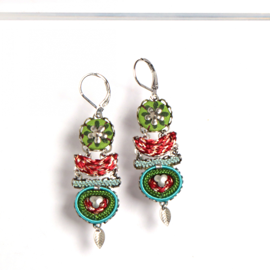 レッド、グリーン、ターコイズブルーのエキゾチックな色使い。小さな葉っぱ型の真鍮パーツが可愛い作品。