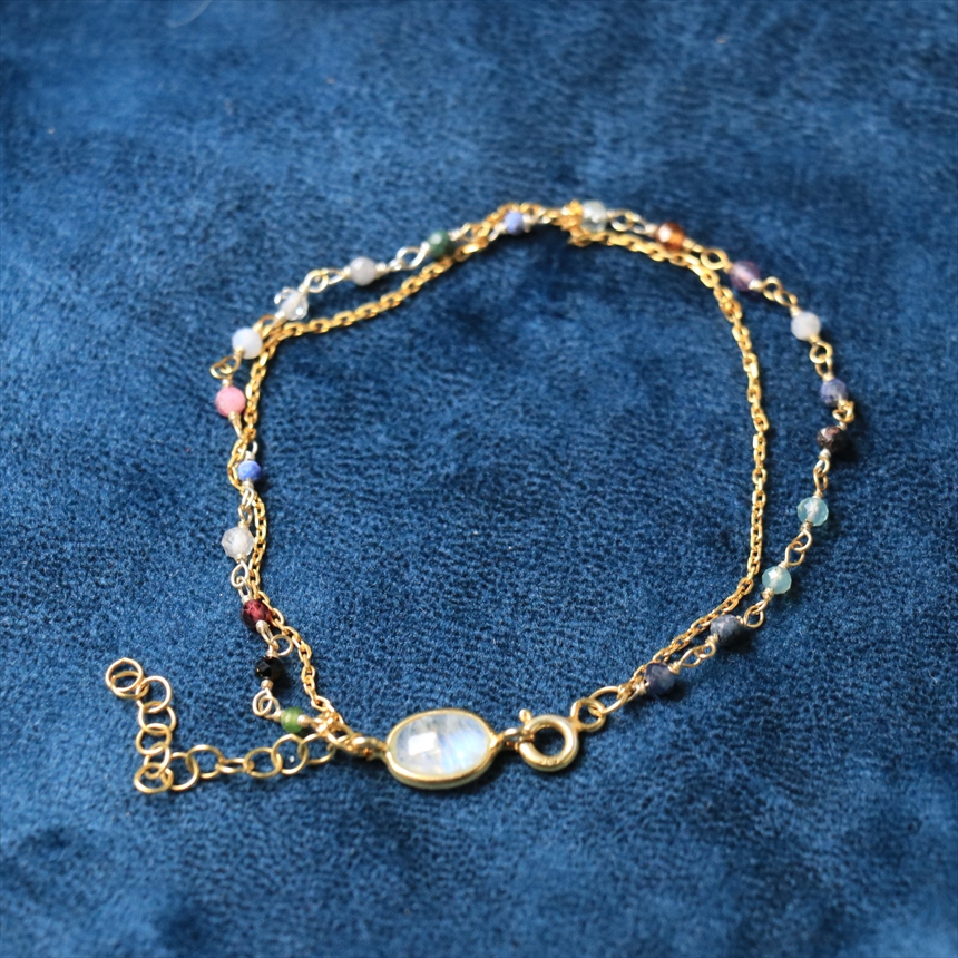 ミックスカラーの小粒のトルマリンビーズとシルバーチェーンの2連ブレスレット。きれいなシラーのはいったムーンストーンがアクセントです。優し気な色合いのストーンと華奢なゴールドチェーンが手元をきれいにみせてくれます。