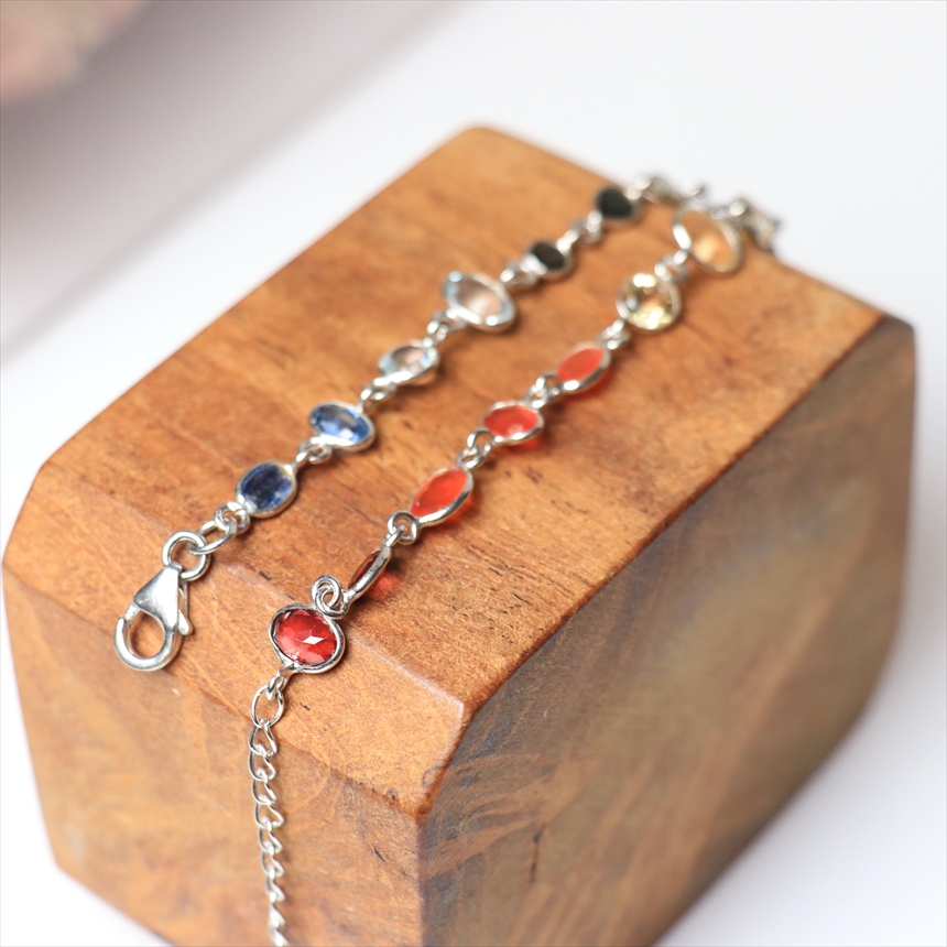 ガーネット2粒(赤)、カーネリアン3粒(オレンジ)、シトリン3粒(薄黄色)、ペリドット3粒(ライムグリーン)、グリーントルマリン2粒(モスグリーン)、ブルートパーズ2粒(クリアブルー)、カイヤナイト2粒(ブルー)の7種類のストーンが贅沢につながれたブレスレット。一粒一粒の石の色彩が艶やかで大変美しく、光があたるたびにきらめき華やかで気品を感じます。※石一粒縦横0.5~0.8cm