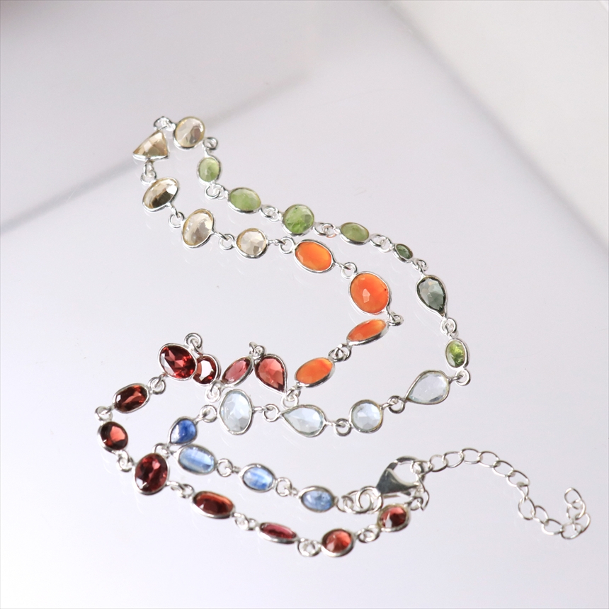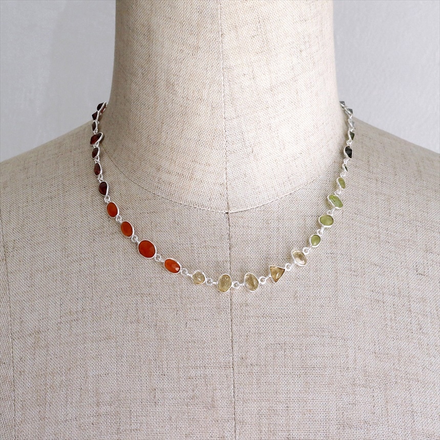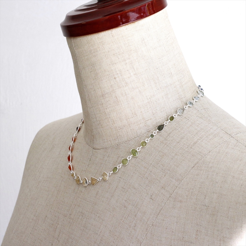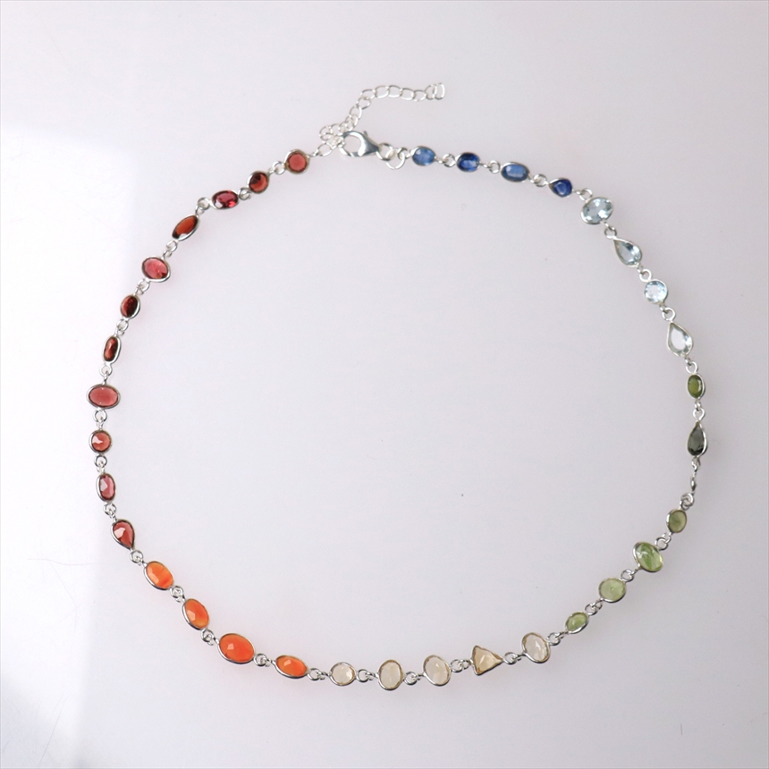 ガーネット11粒(赤)、カーネリアン4粒(オレンジ)、シトリン5粒(薄黄色)、ペリドット4粒(ライムグリーン)、グリーントルマリン3粒(モスグリーン)、ブルートパーズ4粒(クリアブルー)、カイヤナイト4粒(ブルー)の7種類のストーンが贅沢につながれたネックレス。一粒一粒の石の色彩が艶やかで大変美しく、光があたるたびにきらめき華やかで気品を感じます。こちらは首元に沿うようにつけていただけるショートサイズです。※石一粒縦横0.5~0.8cm