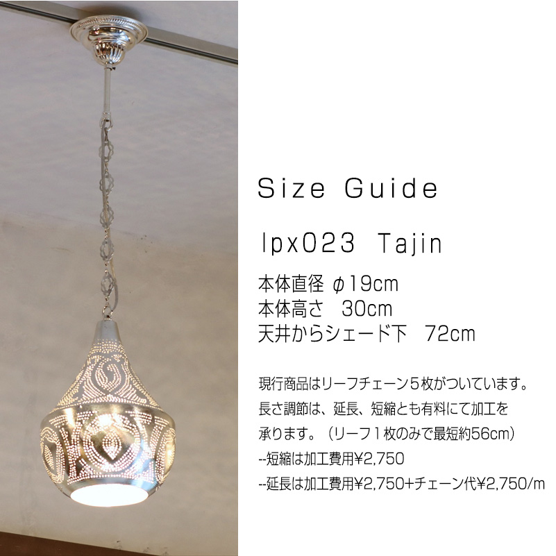 | 仕 様 | 口金/E17 60Wまで対応 ※LED電球対応 全高の延長・短縮は加工費用 2,750+チェーン代 2,750/mより承ります。 |