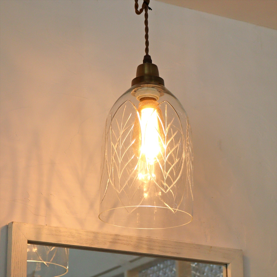 - ガラスシェード ガラスペンダントランプ 1灯 フィカス クリア 切子 木の葉 レトロ