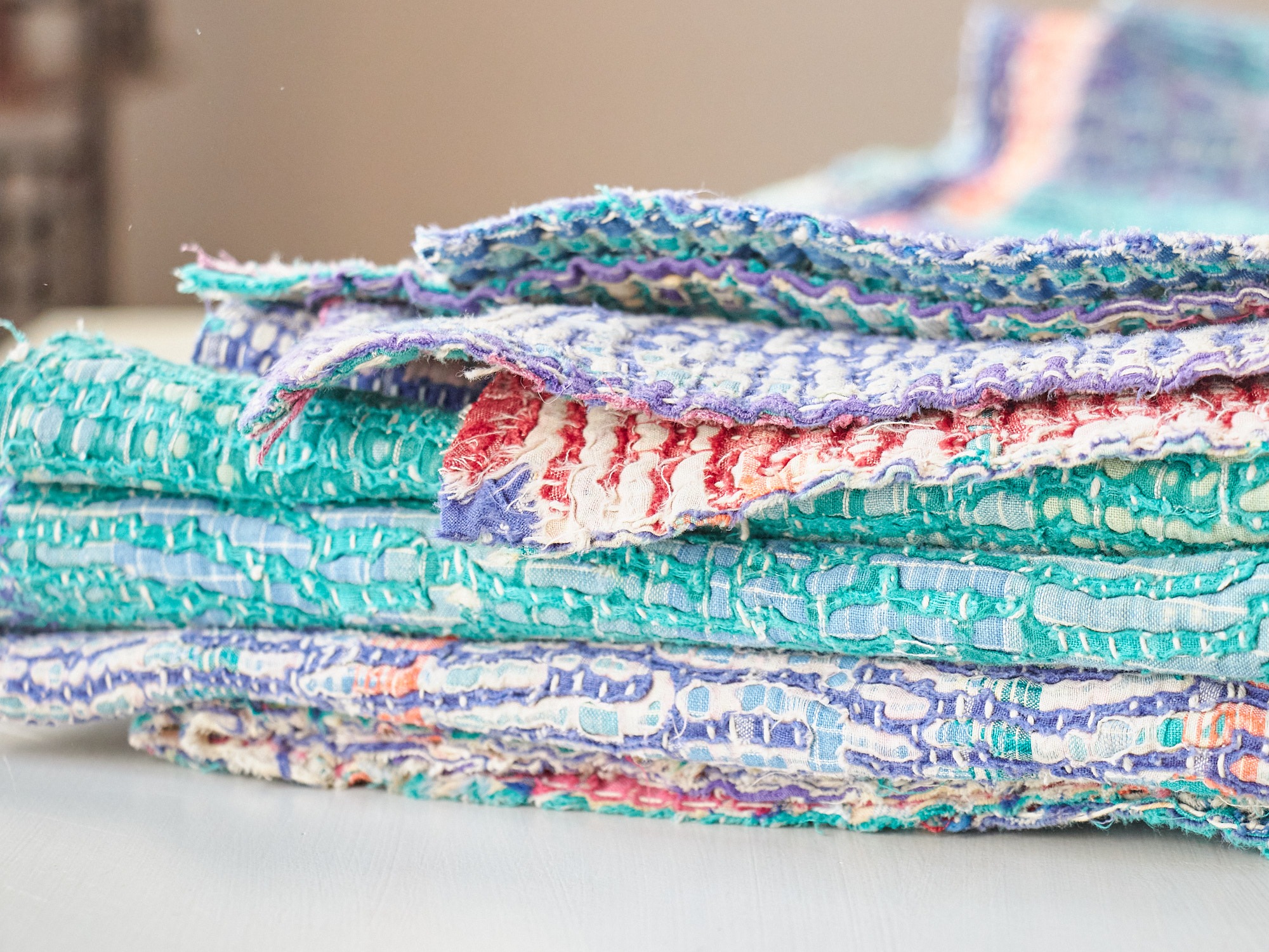 このピースは、かなり使い込まれていて、両面とも表面の生地は擦り切れて、全面に下地の布が見えています。これだけ使っても、刺し子ステッチが補強となって、しっかりとした布になっています。