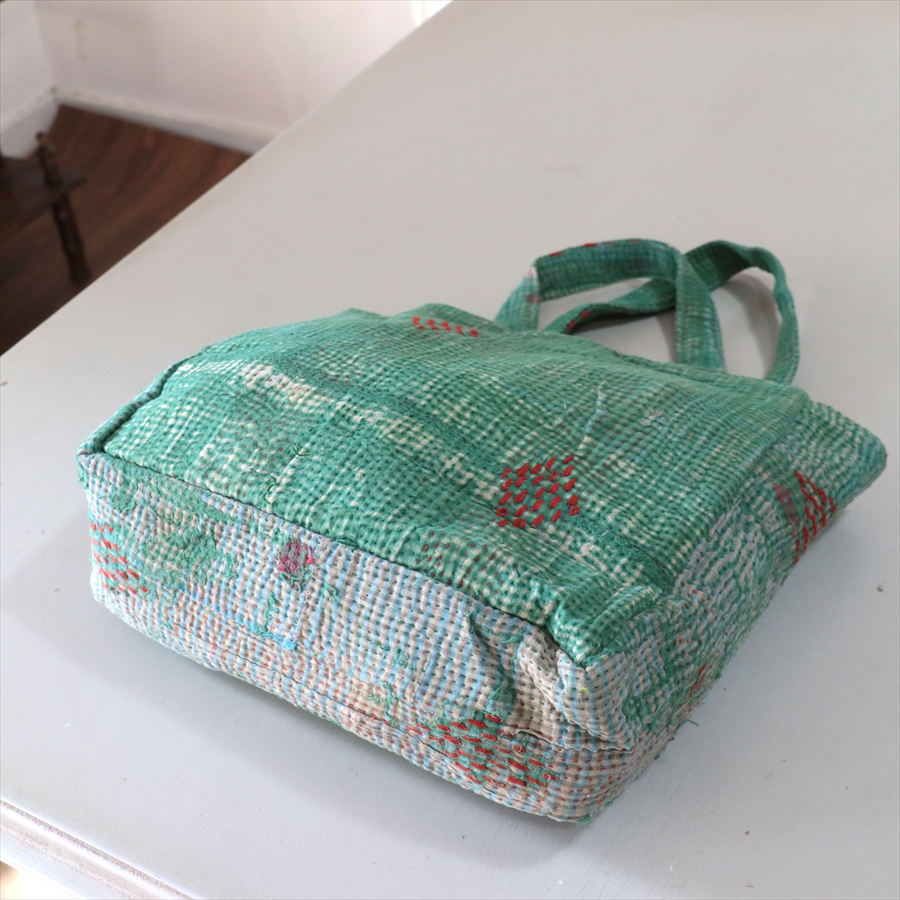 使い古された民族衣装のサリーやドゥパタを重ねて、刺し子刺繍をした伝統的な手仕事の布を使っています。表面のコットンは擦り切れているところもあるほど使い込まれていて、ヴィンテージ感たっぷり。コットンのやわらかな肌触りが心地よく、普段使いのバッグとして活躍してくれそうです。
