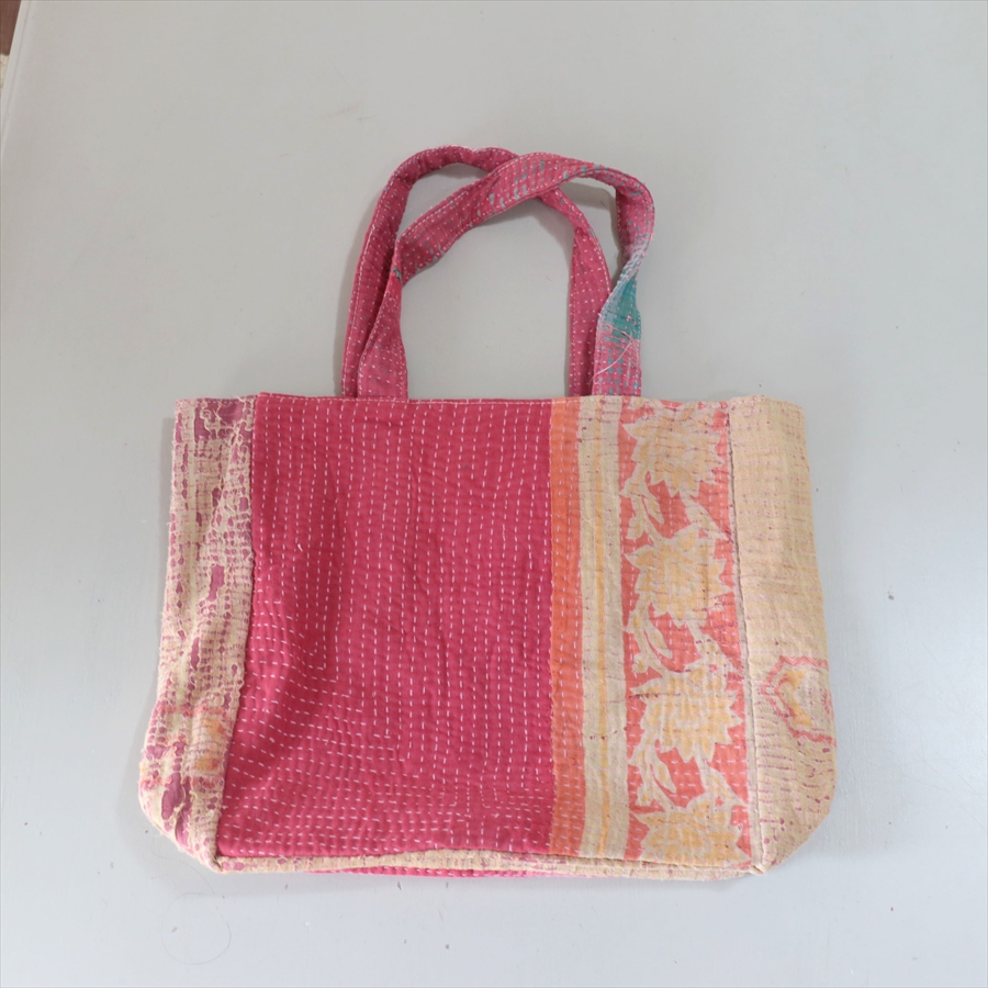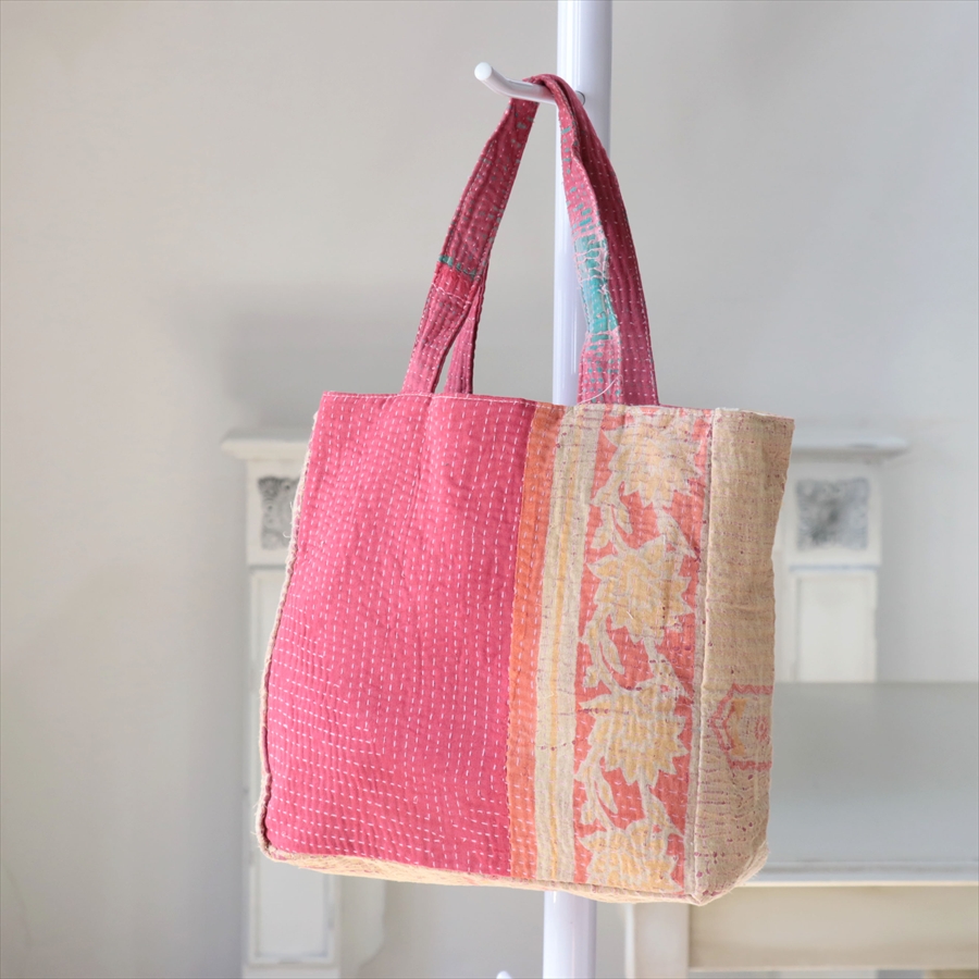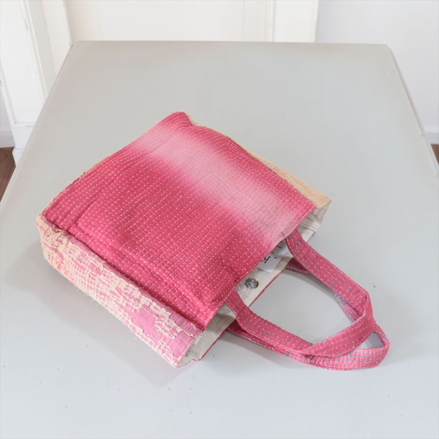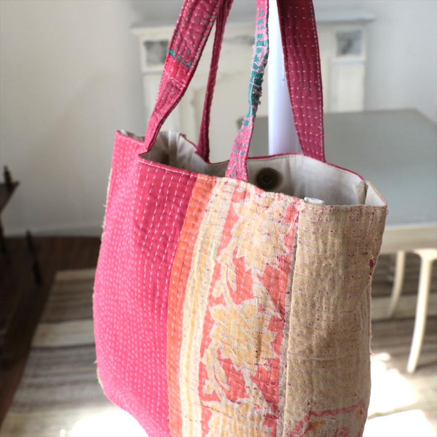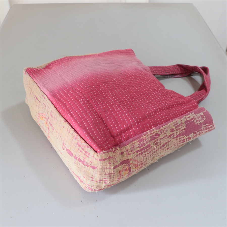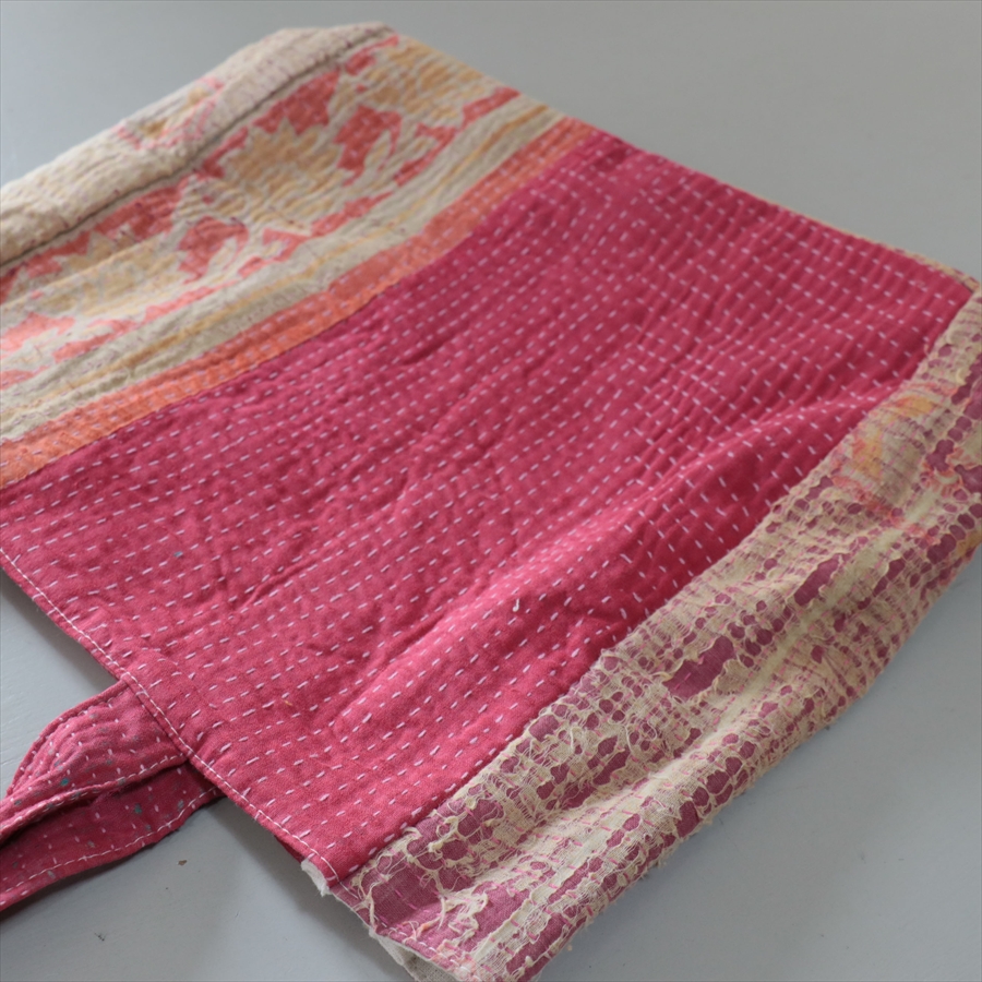 使い古された民族衣装のサリーやドゥパタを重ねて、刺し子刺繍をした伝統的な手仕事の布を使っています。表面のコットンは擦り切れているところもあるほど使い込まれていて、ヴィンテージ感たっぷり。コットンのやわらかな肌触りが心地よく、普段使いのバッグとして活躍してくれそうです。