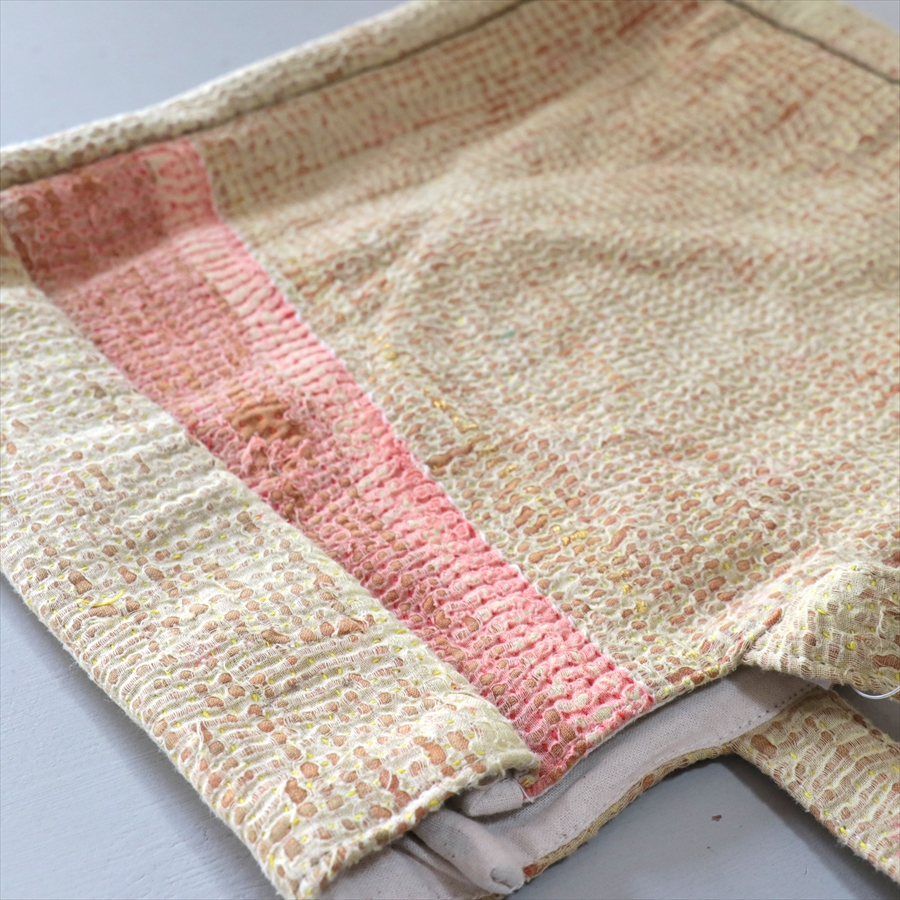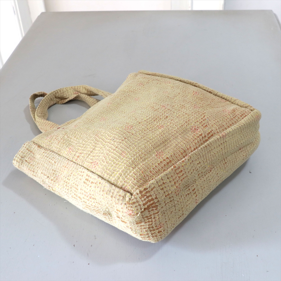 使い古された民族衣装のサリーやドゥパタを重ねて、刺し子刺繍をした伝統的な手仕事の布を使っています。表面のコットンは擦り切れているところもあるほど使い込まれていて、ヴィンテージ感たっぷり。コットンのやわらかな肌触りが心地よく、普段使いのバッグとして活躍してくれそうです。