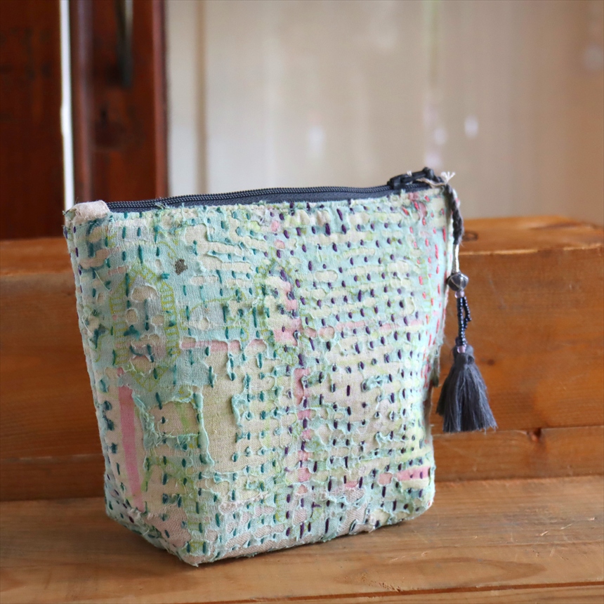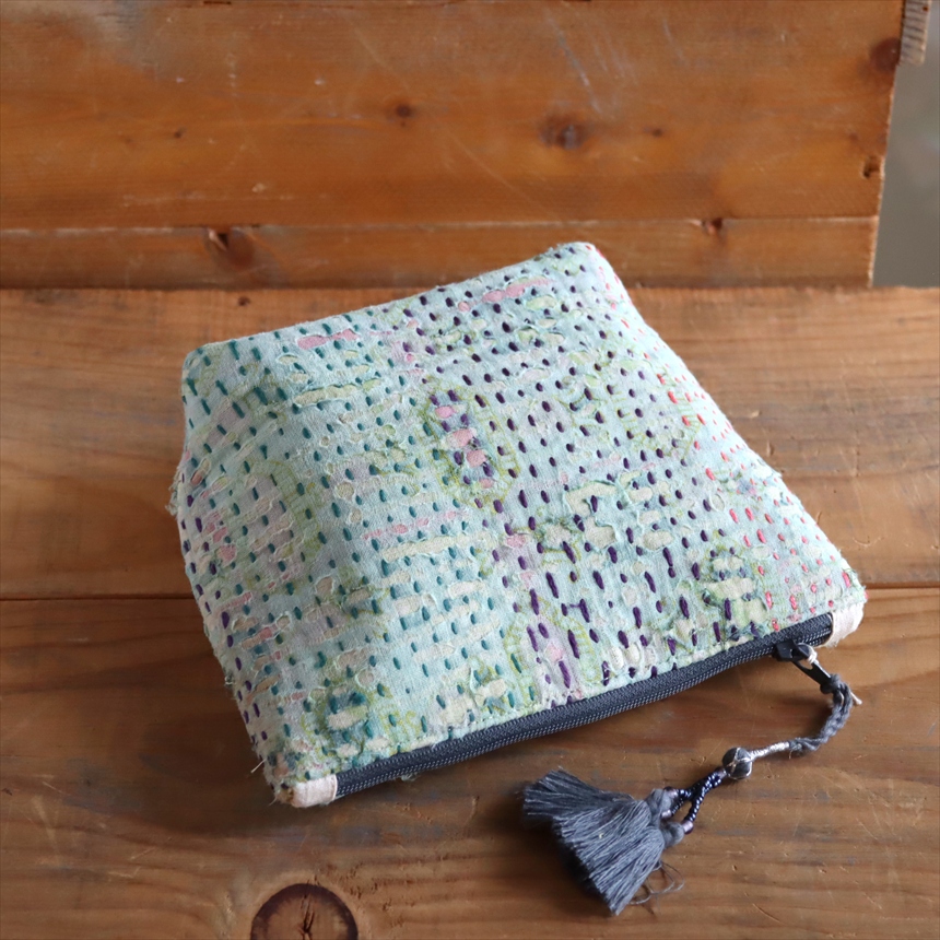 - ヴィンテージカンタ マチ付きポーチ カンタ刺繍 タッセル付き ラリーキルト インド 古布 グレー・ピンク・グリーン