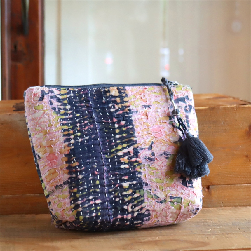 - ヴィンテージカンタ マチ付きポーチ カンタ刺繍 タッセル付き ラリーキルト インド 古布