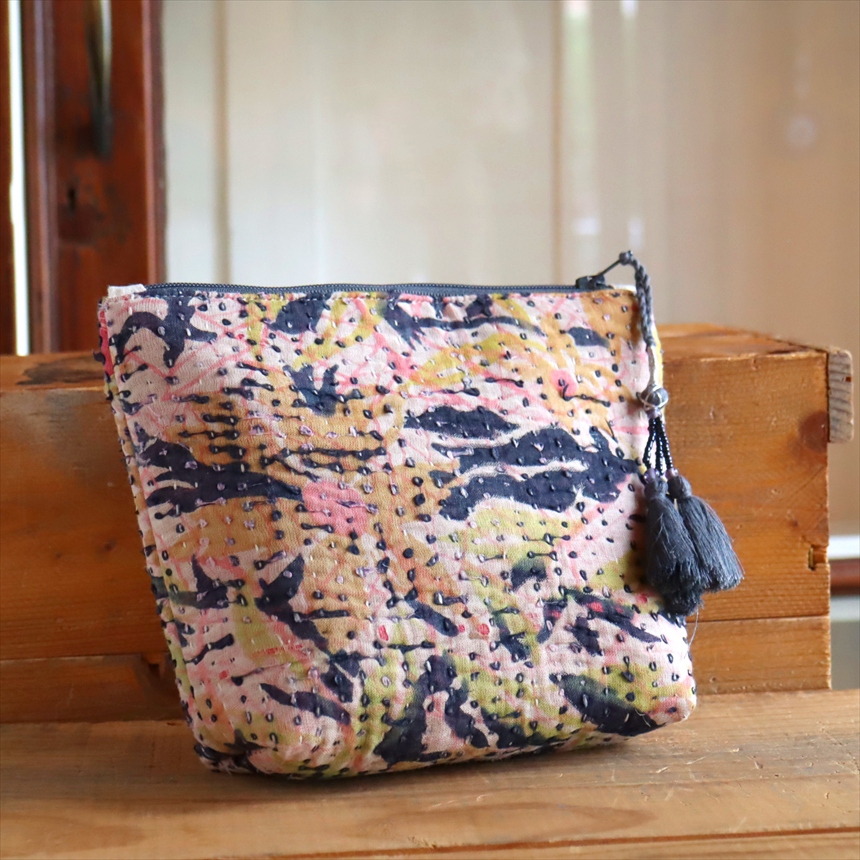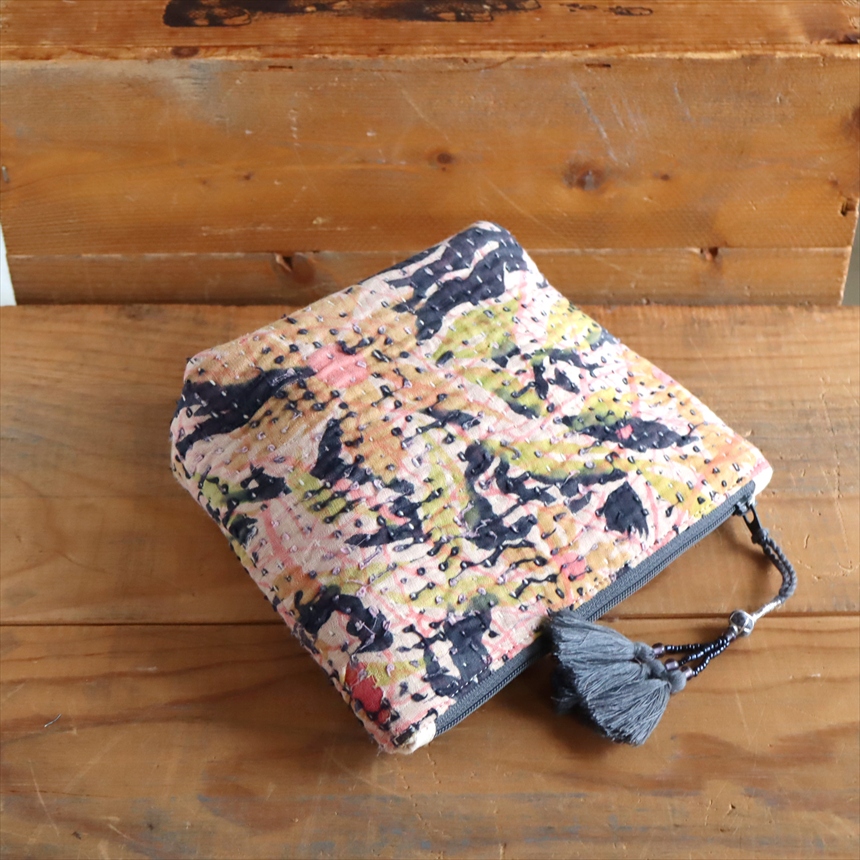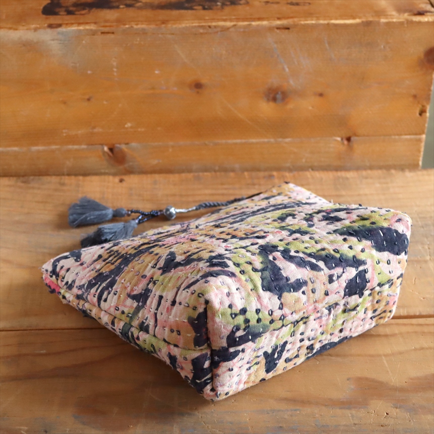 - ヴィンテージカンタ マチ付きポーチ カンタ刺繍 タッセル付き ラリーキルト インド 古布