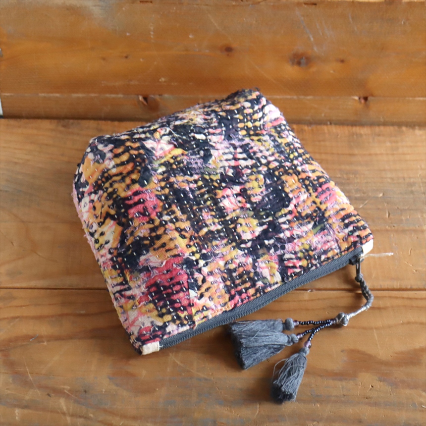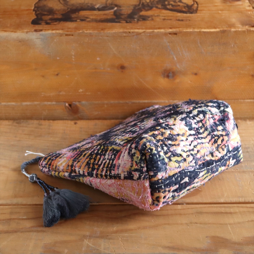 - ヴィンテージカンタ マチ付きポーチ カンタ刺繍 タッセル付き ラリーキルト インド 古布 ピンク系