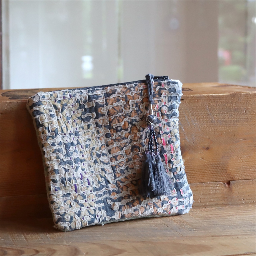- ヴィンテージカンタ フラットポーチ カンタ刺繍 タッセル付きラリーキルト 現品 グレー系