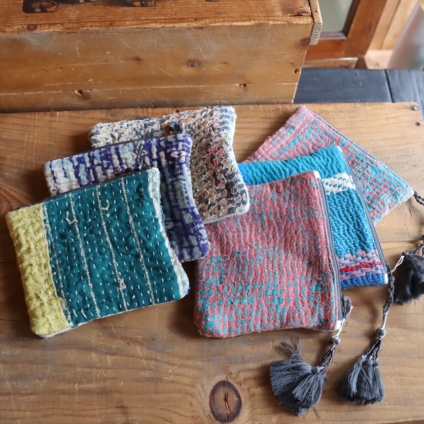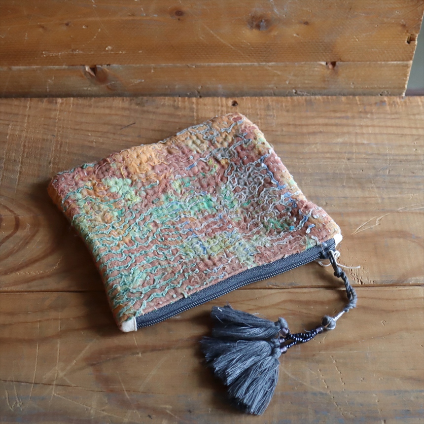 - ヴィンテージカンタ フラットポーチ カンタ刺繍 タッセル付きラリーキルト 現品 グレー系