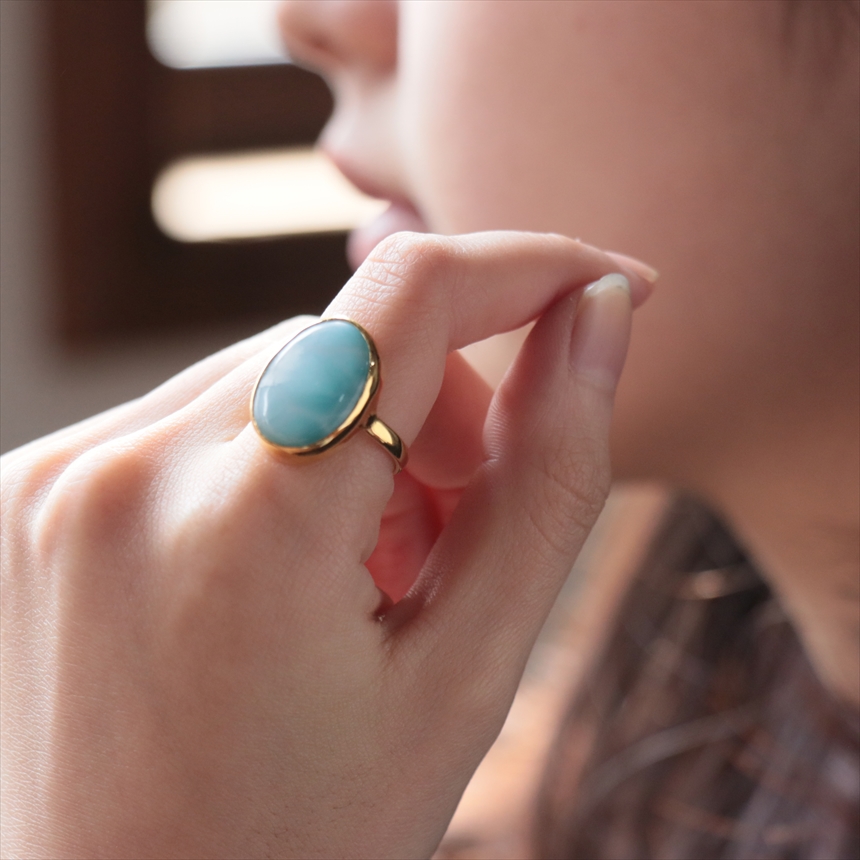 ラリマー特有の乳白色が混ざったブルーに、波模様が見えるリングです。丸みを帯びたオーバルのフォルムが、手元に穏やかで上品な印象を与えます。