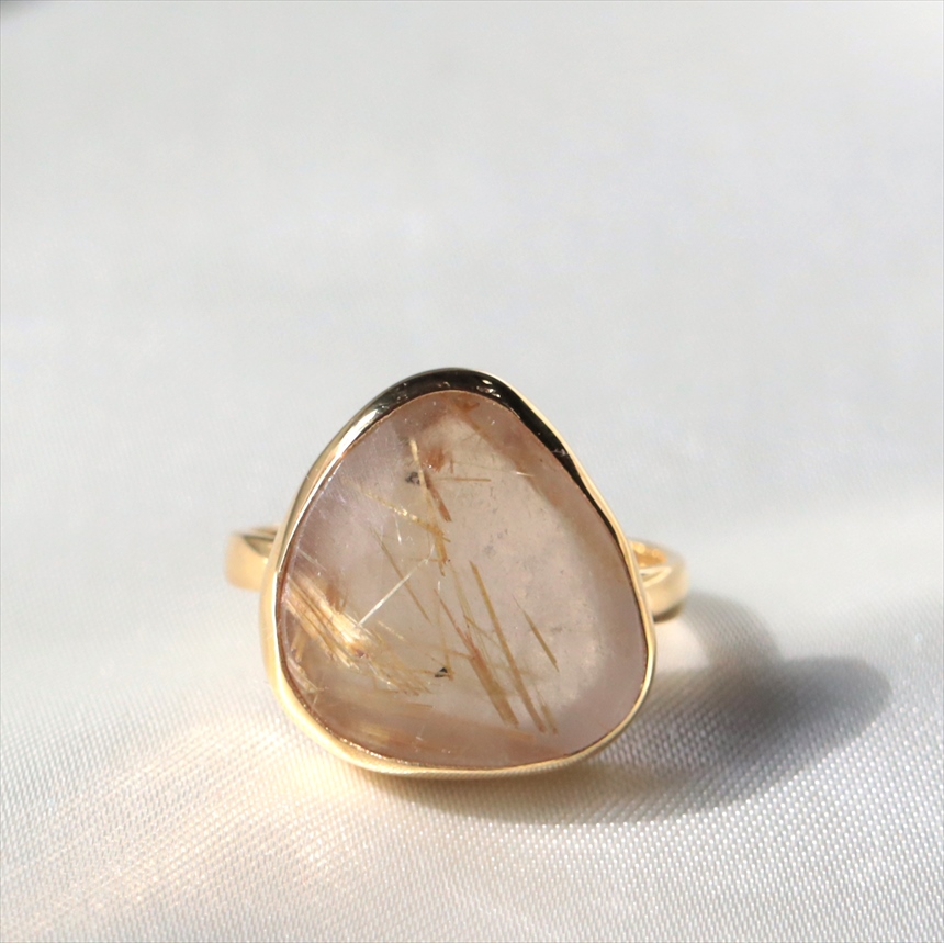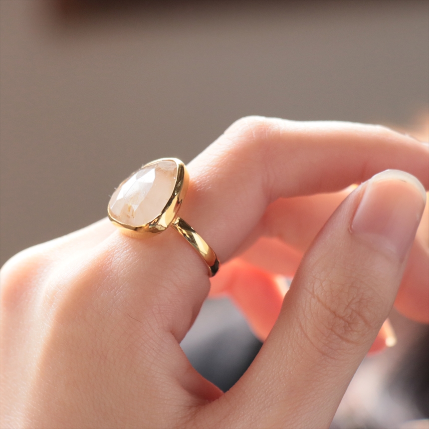 クリアなクォーツの中に繊細なゴールドの針(ルチル)が閉じ込められた、自然が生んだ神秘ともいえる、ルチルクォーツのリングです。肌に溶け込むヌーディーな色調にゴールドが煌めき、手元をより洗練された知的な印象にみせてくれます。