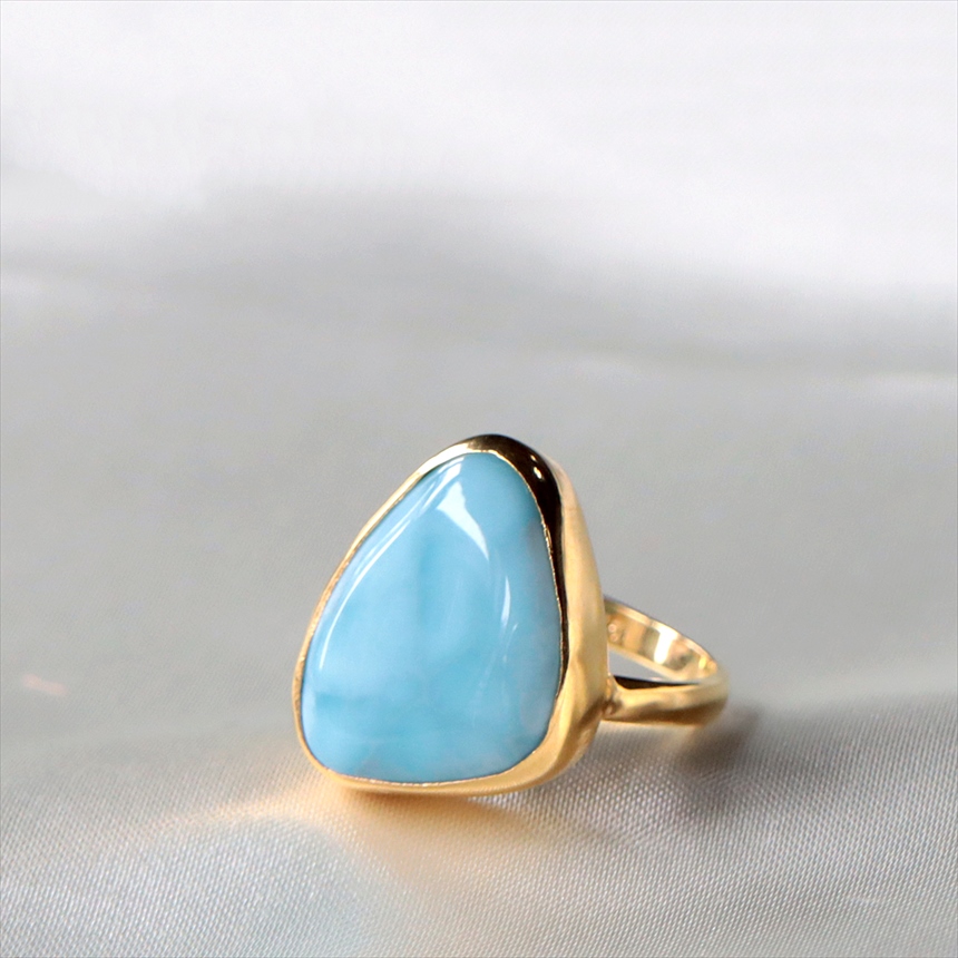ラリマー特有の乳白色が混ざったブルーに、波模様が見えるリングです。丸みを帯びた、柔らかな三角形。この有機的なラインが、ラリマーの優しいブルーと相まって、手元に穏やかで上品な印象を与えます。